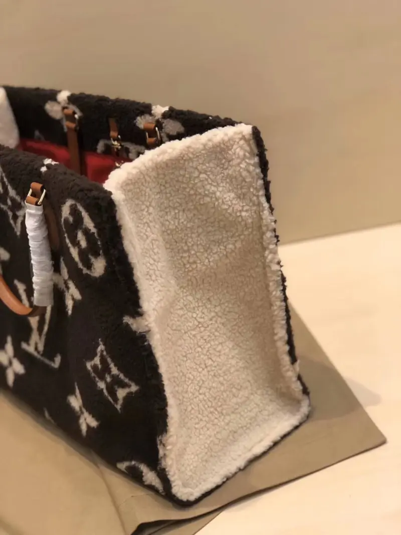 Discover the ultimate blend of cozy style and generous capacity with this modern tote bag. Crafted from exceptionally soft, plush shearling, this bag features an intricate, oversized geometric pattern for a bold and contemporary look. Its fluffy texture and inviting feel make it a standout accessory for any season.