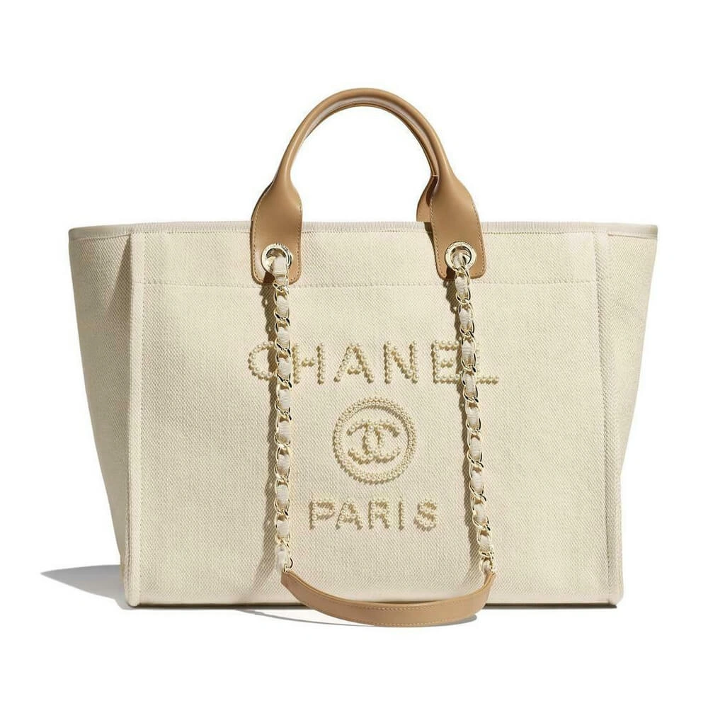 Discover your new essential accessory with this beautifully crafted large shopping tote, designed for both everyday elegance and practical utility. Its durable mixed-fiber canvas construction in a neutral ecru hue offers a timeless look, while the front is adorned with a sophisticated logo meticulously crafted from shimmering imitation pearls for a touch of glamour.