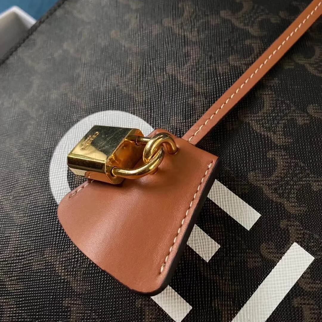 This elegantly designed vertical tote offers a perfect blend of timeless style and everyday functionality. Crafted from a durable coated canvas featuring a classic arch pattern, it is complemented by smooth calfskin leather handles and trim. The structured silhouette provides ample space for your essentials, making it an ideal companion for both work and weekend outings. A decorative padlock on a leather key cover adds a refined touch to the exterior.