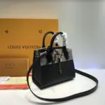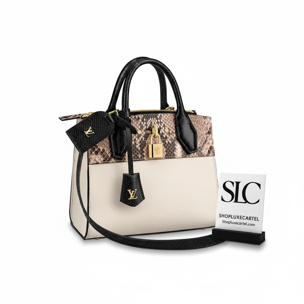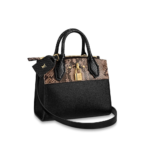Experience the pinnacle of sophisticated craftsmanship with this miniature top-handle satchel, a timeless piece for the discerning wardrobe. This bag is expertly fashioned from a luxurious blend of grained calfskin and genuine python leather, presenting a structured silhouette that exudes elegance. The striking contrast in textures makes for a visually captivating accessory, perfectly suited to elevate any daytime or evening look.