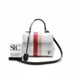 This beautifully structured top handle bag offers a timeless silhouette crafted from durable, grained leather and accented with smooth leather trim. A distinctive two-tone stripe detail adds a modern and eye-catching touch to its classic design. Polished silver-tone hardware completes the look, making it a sophisticated choice for any occasion. The versatile design features both a sturdy top handle for carrying by hand and a removable strap for comfortable shoulder or crossbody wear.