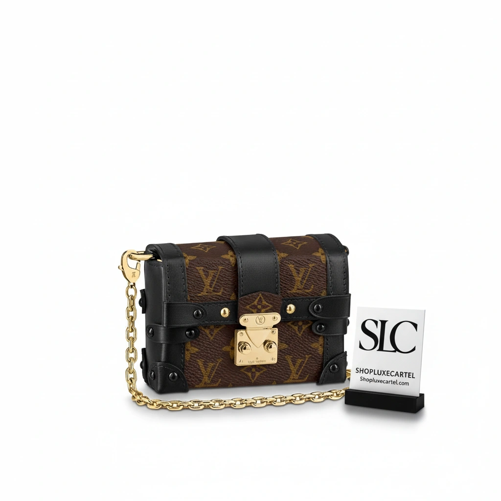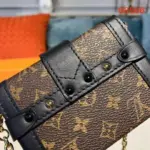 Inspired by the timeless design of historic travel trunks, this structured bag offers a sophisticated and compact accessory for your essentials. Its classic rectangular silhouette is meticulously crafted from durable coated canvas, featuring a distinctive repeating geometric pattern, and is elegantly framed with smooth calf leather trim and polished metal studs.