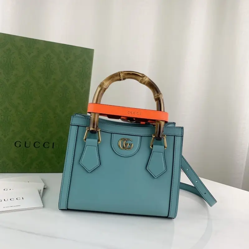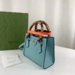 This beautifully structured mini tote combines classic design with a contemporary twist. Crafted from fine light blue leather, its most defining features are the elegantly curved bamboo top handles. The bag’s clean, sophisticated silhouette is accented by a distinctive gold-toned emblem and two vibrant, decorative neon bands that add a playful pop of color and help maintain the handles’ perfect shape.