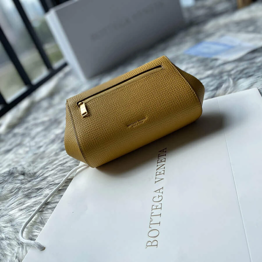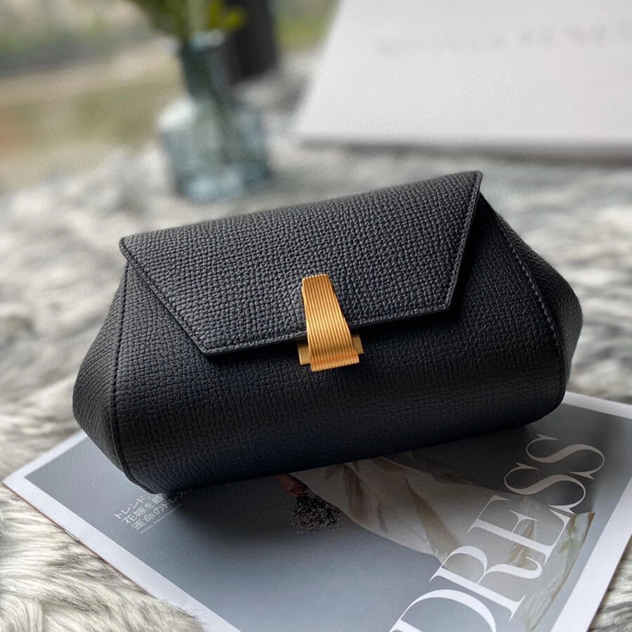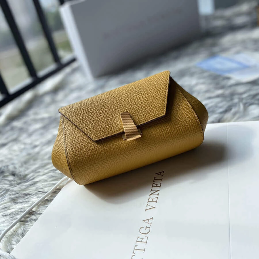 Defined by its clean lines and a distinctive angular silhouette, this mini bag offers a modern take on classic elegance. Crafted from premium calfskin with a subtle grainy texture and a soft sheen, it provides a sophisticated touch to any outfit. Its compact, trapezoidal form is both stylish and practical, making it an ideal accessory for day-to-night wear.