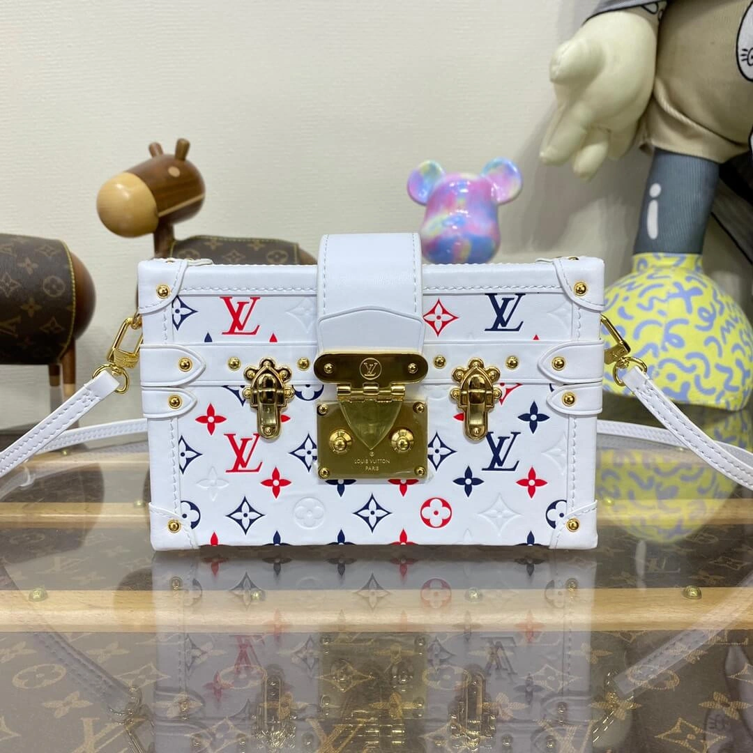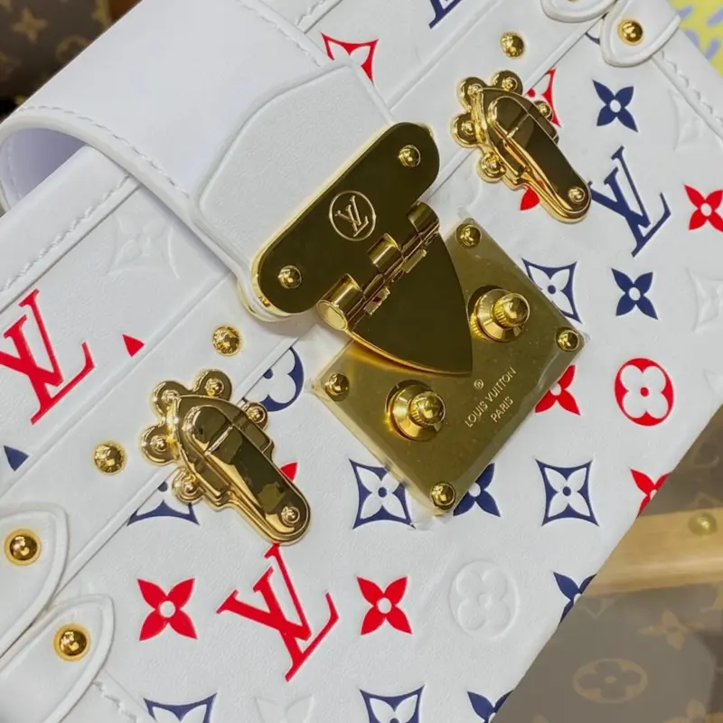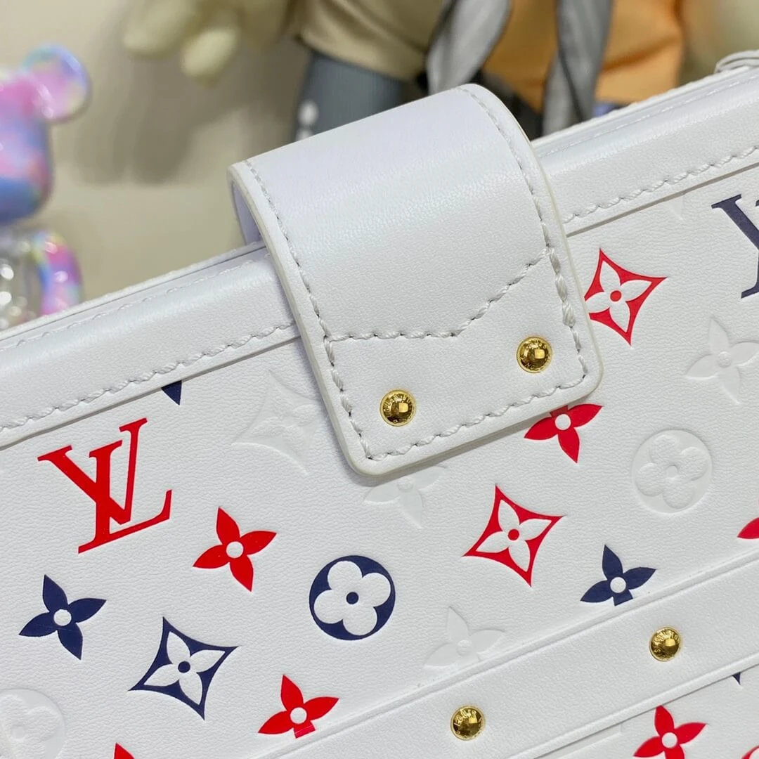 Inspired by the classic design of historical travel trunks, this petite clutch presents a sophisticated, structured silhouette. It is exquisitely crafted from supple white lambskin, adorned with a debossed monogram pattern in a striking red, white, and blue motif. This elegant piece is finished with smooth cowhide-leather trim and gleaming gold-tone hardware, making it a versatile accessory for any occasion.
