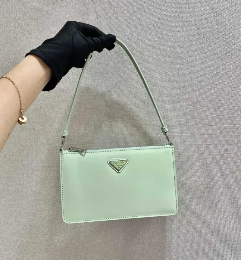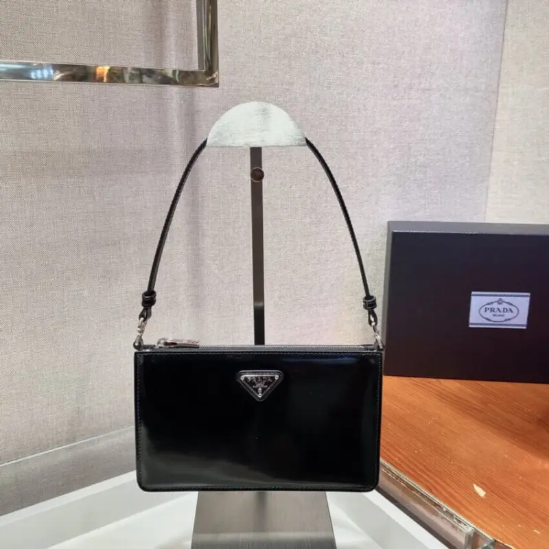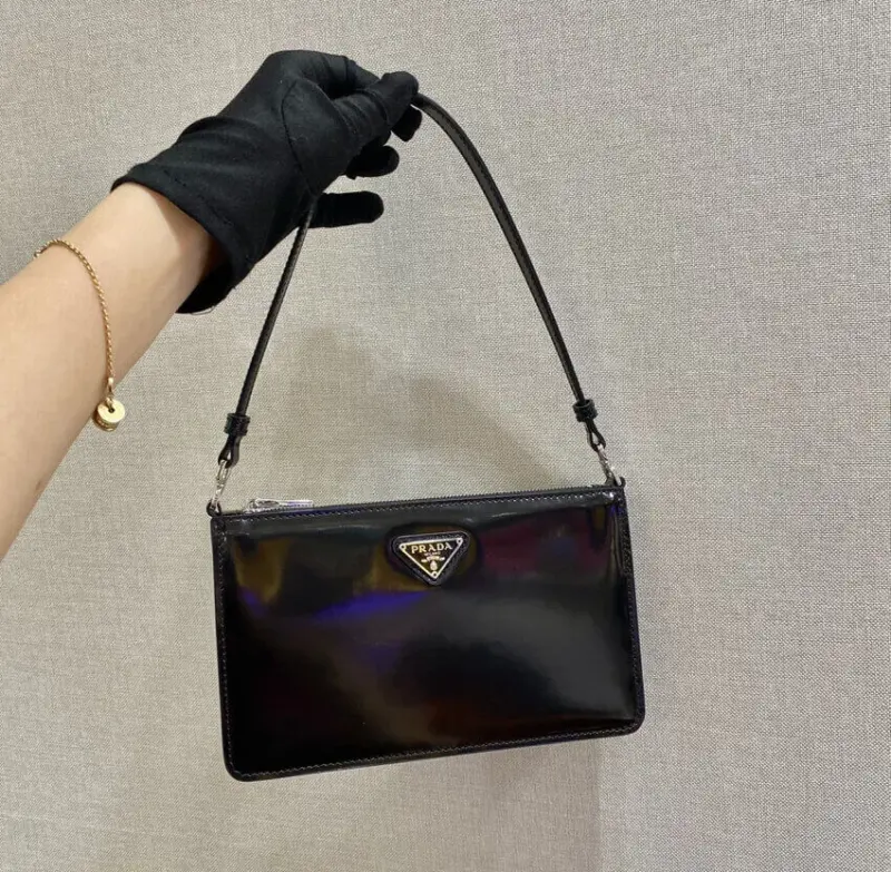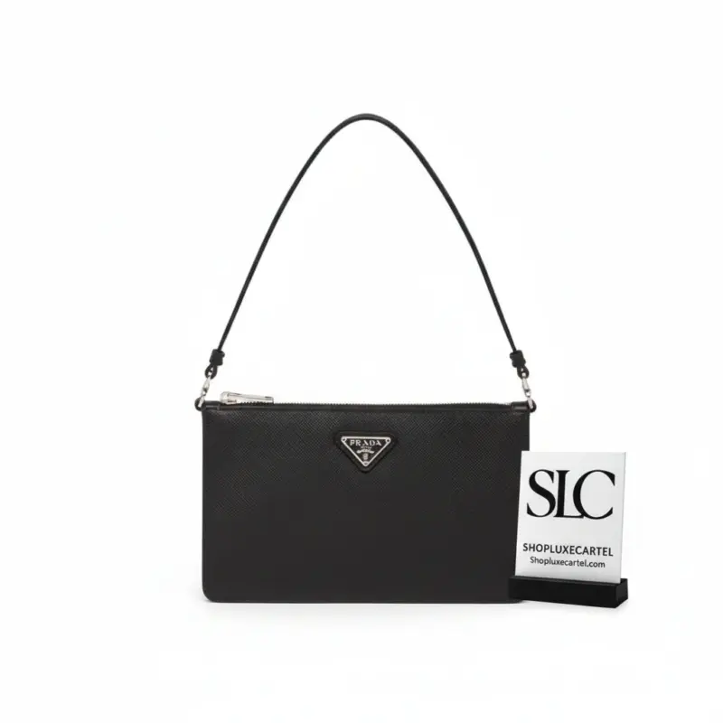 This piece features elegant top handles and is accented with polished metal hardware for a touch of classic shine. The front is tastefully adorned with an enameled metal triangle emblem, adding a point of interest. Inside, a smooth nappa leather lining with convenient card slots keeps your essentials organized, secured by a simple zipper closure.