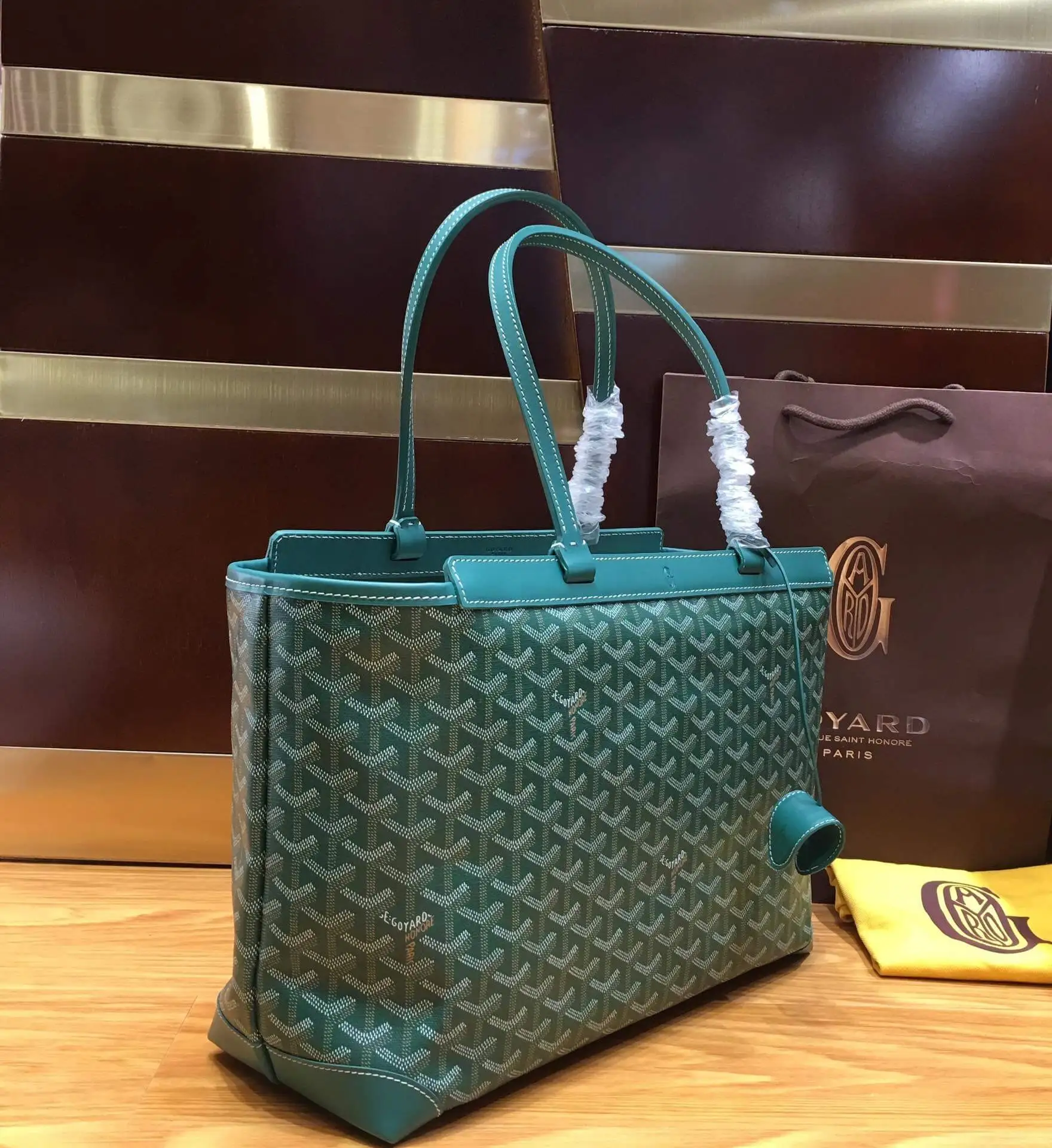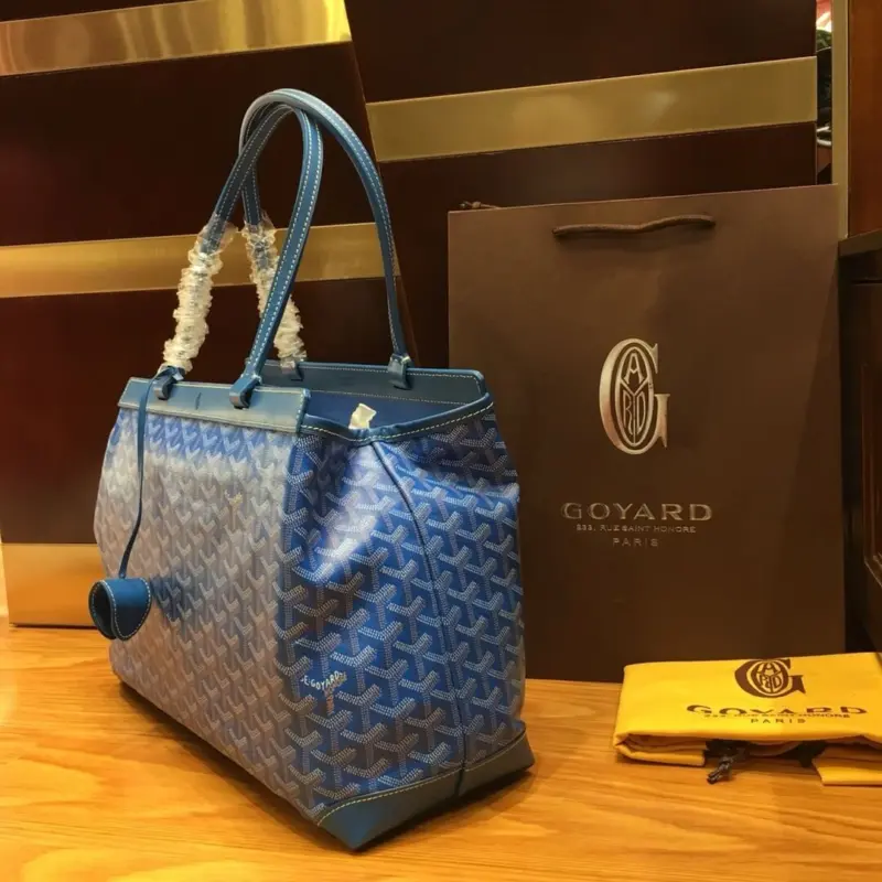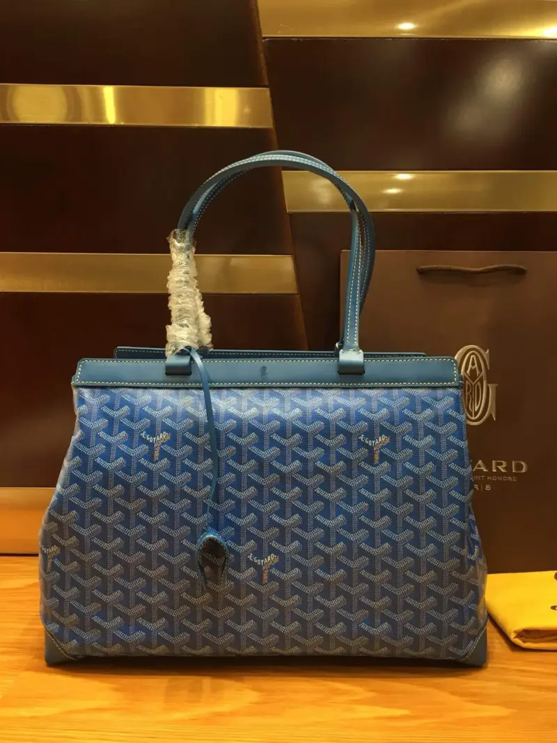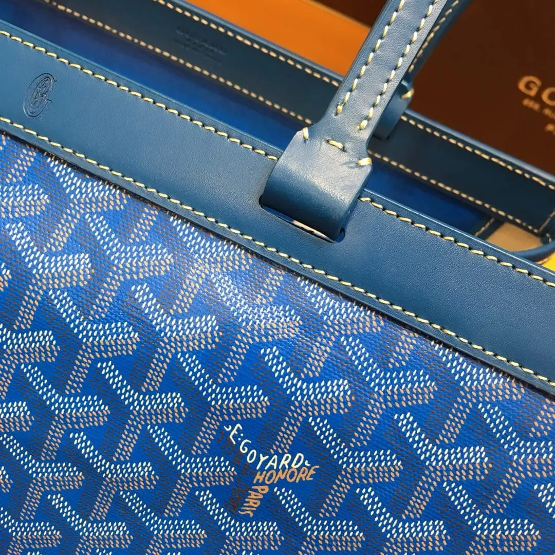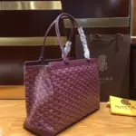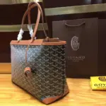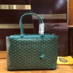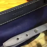This tote is distinguished by its clever and secure closing system. A protective top flap is held in place by a unique leather cord and clamp mechanism that attaches to one of the handles, ensuring your belongings stay safe and covered. This distinctive feature adds a touch of understated elegance to a classic design.