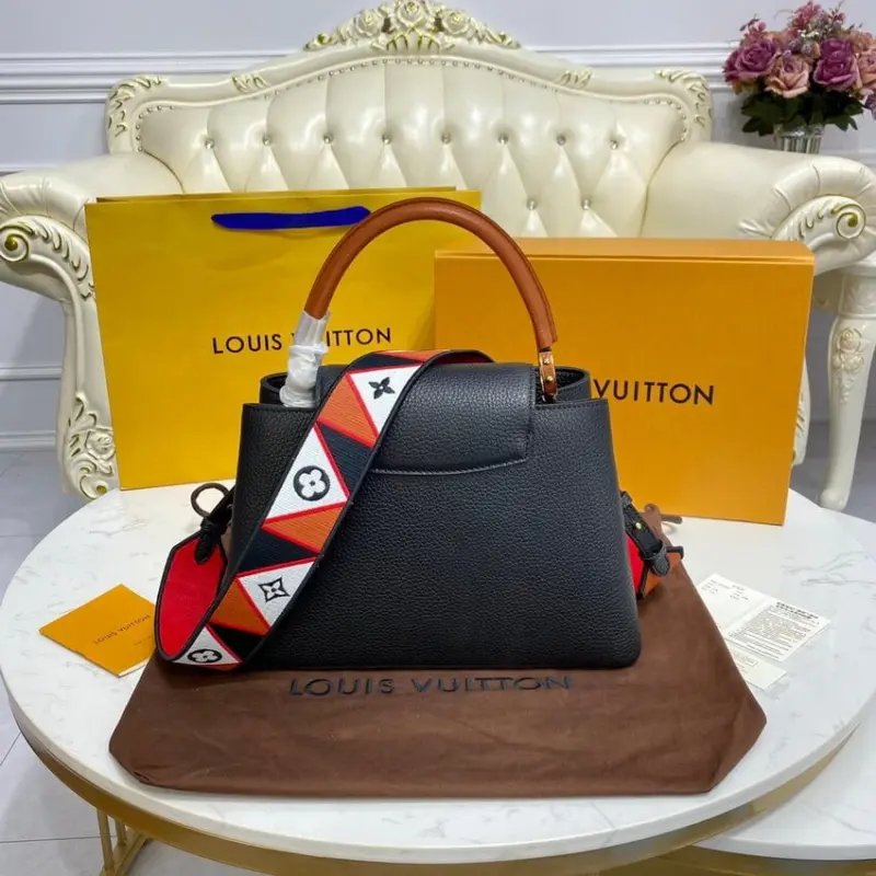 Experience timeless elegance with this beautifully structured top handle handbag. Crafted from luxurious grained Taurillon leather in a striking black hue, this bag is accented with vibrant red details for a sophisticated two-tone effect. Its versatile design features a classic top handle for graceful hand or elbow carry, as well as a wide, detachable strap that allows for comfortable shoulder or cross-body wear.