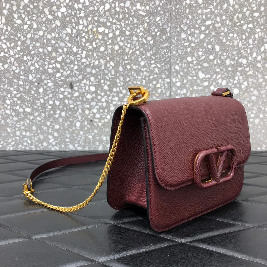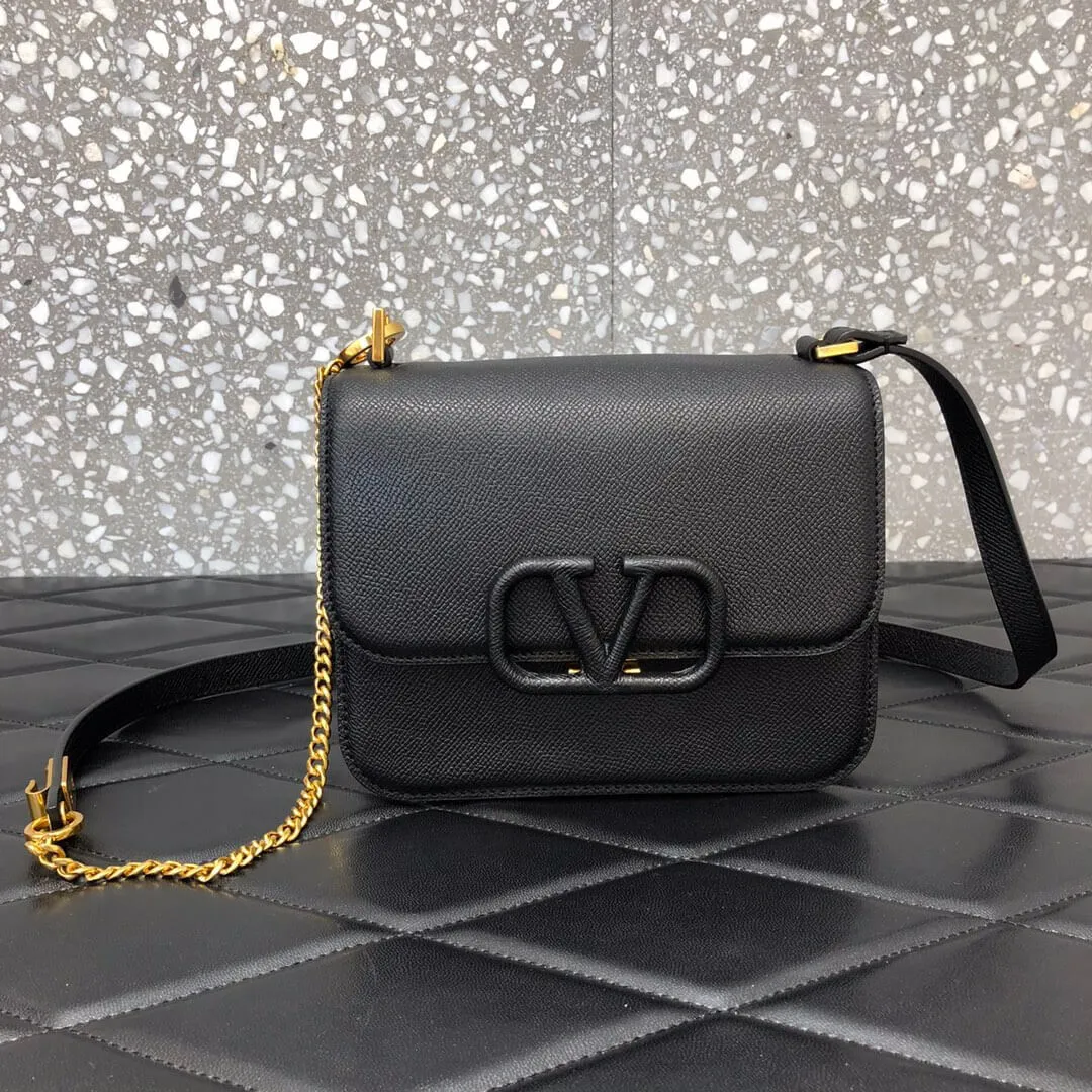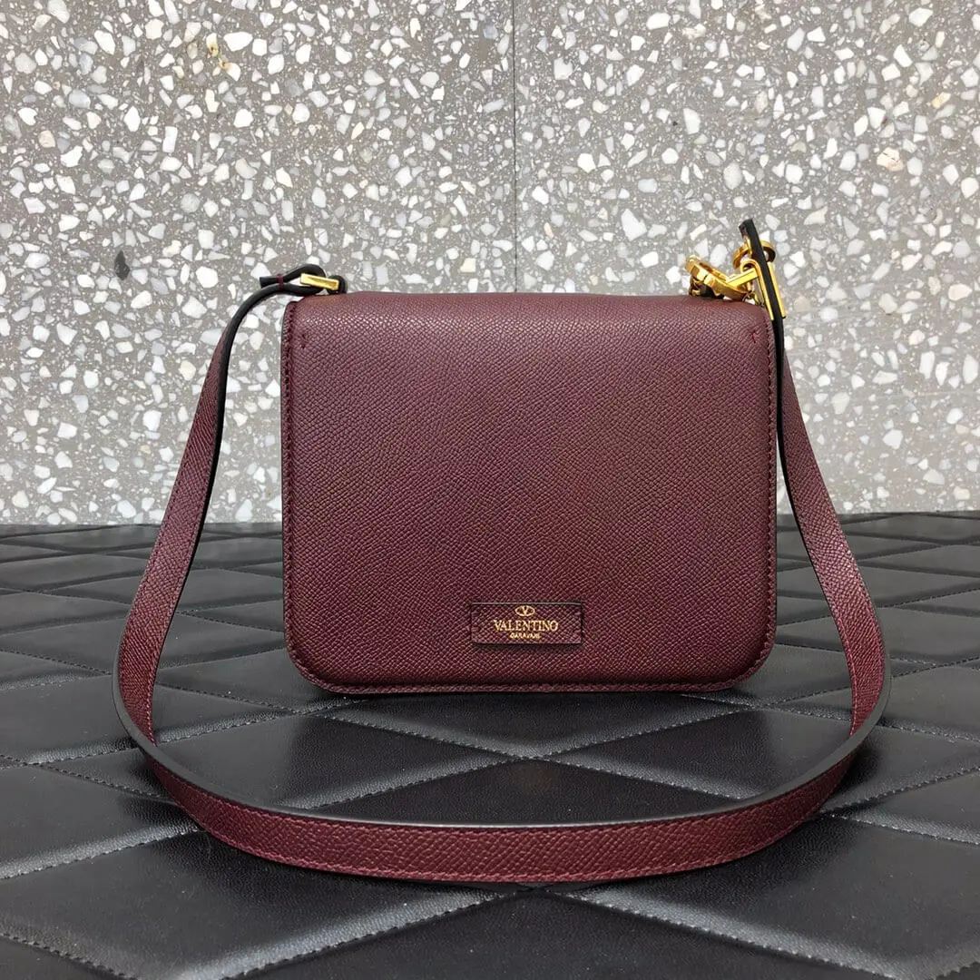 This beautifully designed shoulder bag showcases a sophisticated, structured silhouette crafted from lustrous calfskin leather. Its clean lines and polished appearance are enhanced by a striking V-shaped accent on the front flap, which serves as an elegant focal point. Finished with refined hardware, this compact bag offers a timeless look for both day and evening wear.