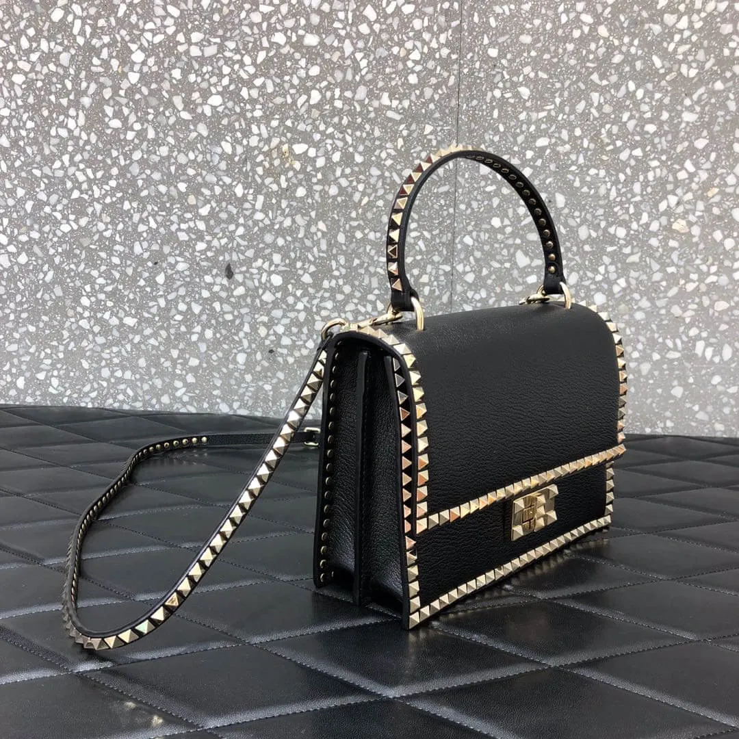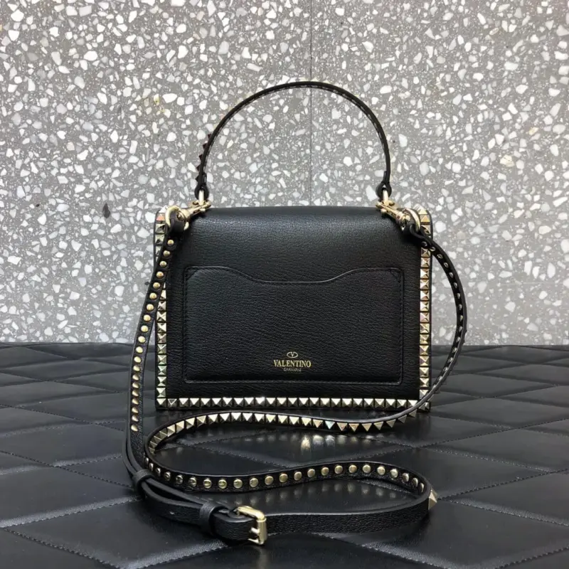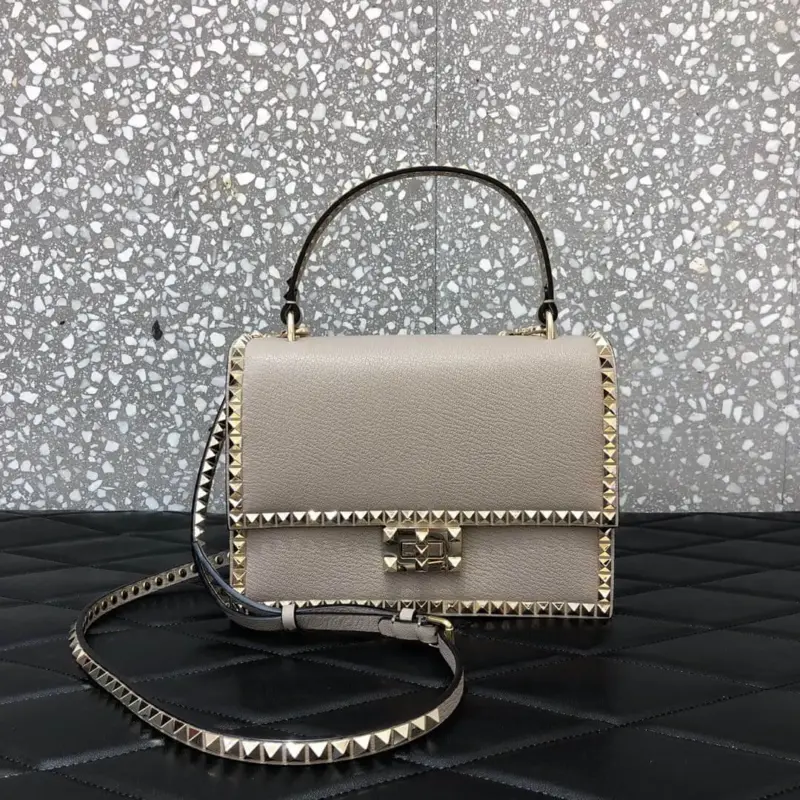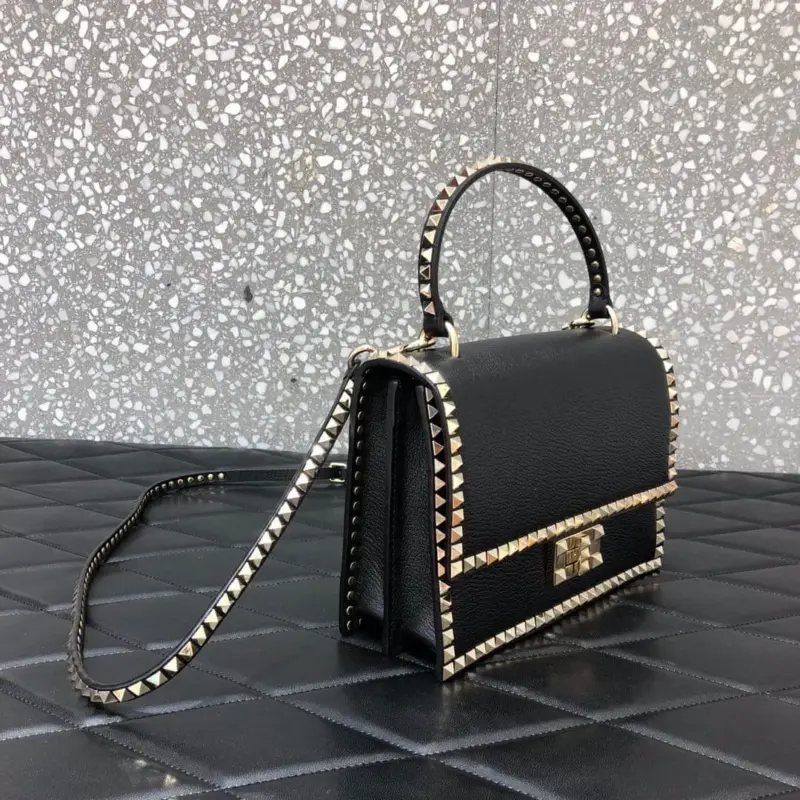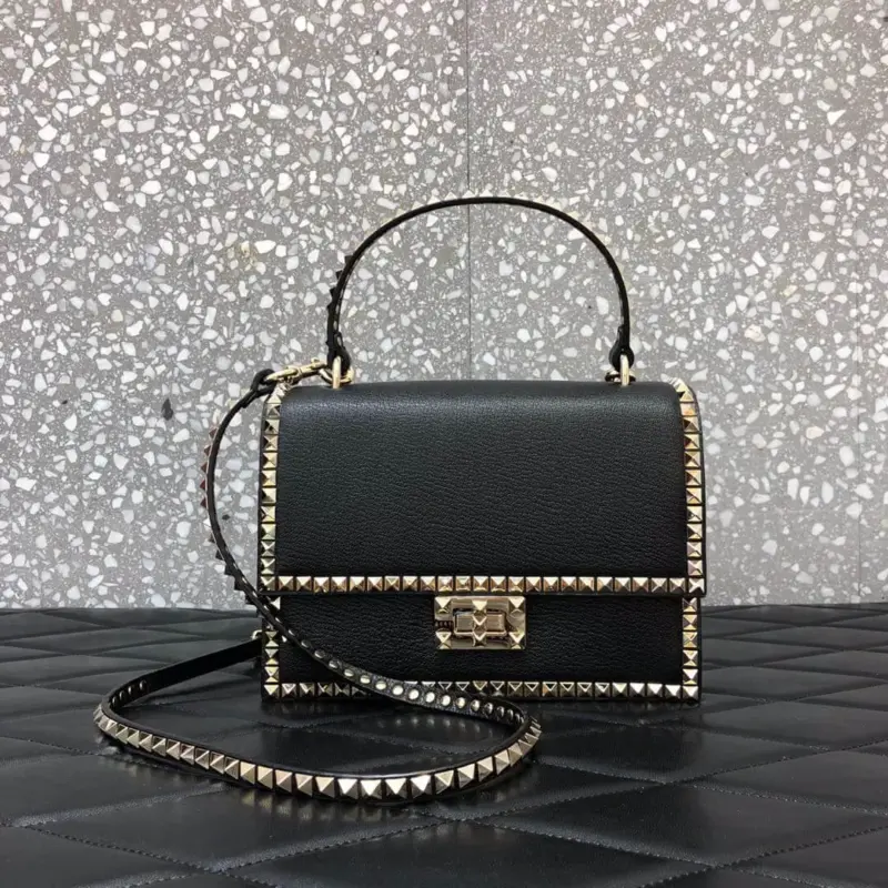 Discover a perfect blend of timeless elegance and modern edge with this exquisitely crafted top handle handbag. Designed for the discerning individual, its structured silhouette is adorned with polished pyramid studs, creating a look that is both sophisticated and daring. This versatile accessory is perfect for any occasion, effortlessly transitioning from a daytime shoulder bag to a chic evening clutch.