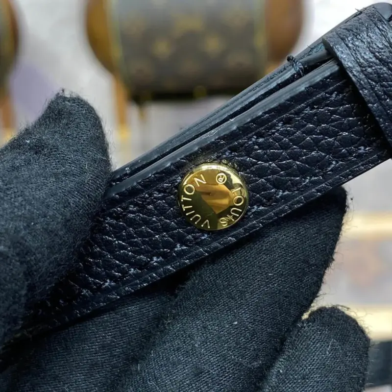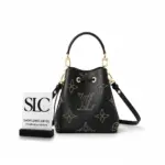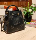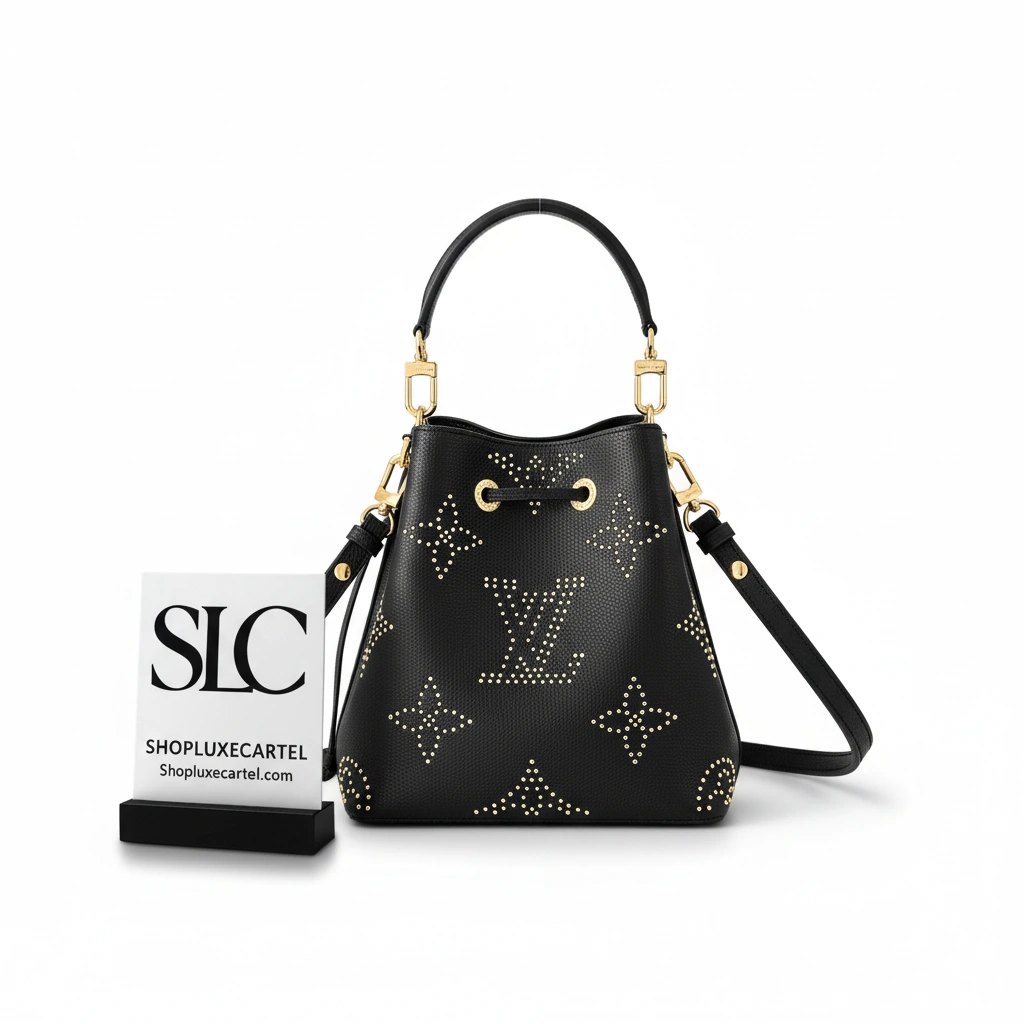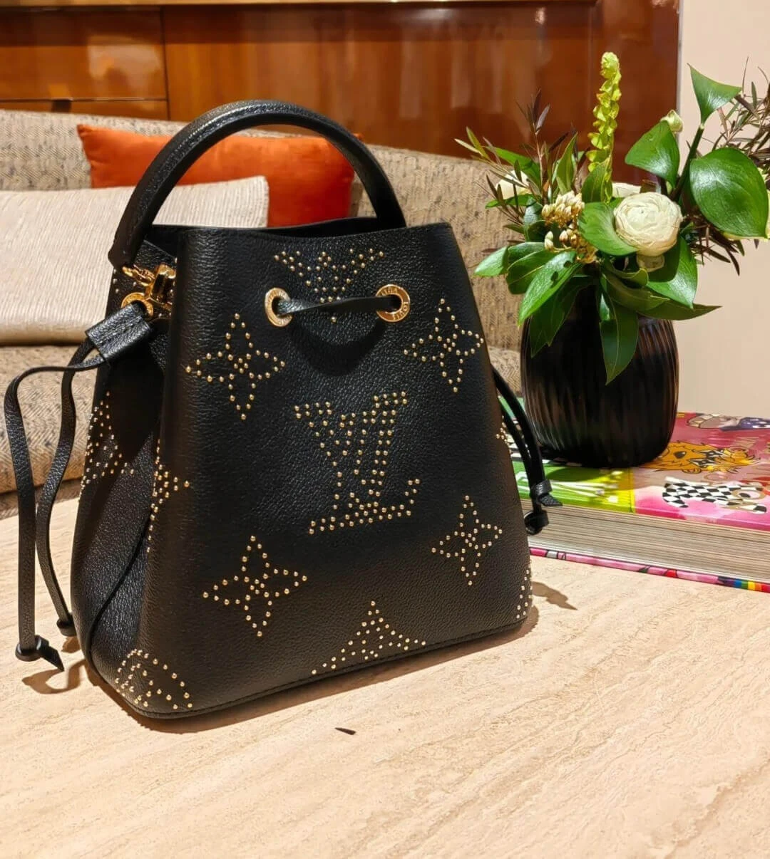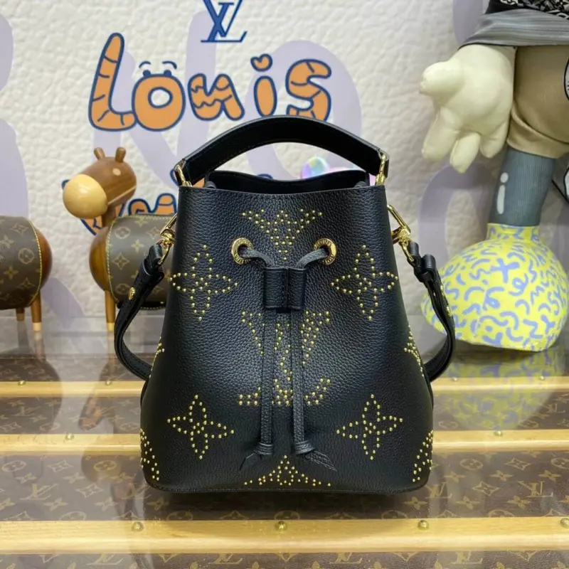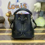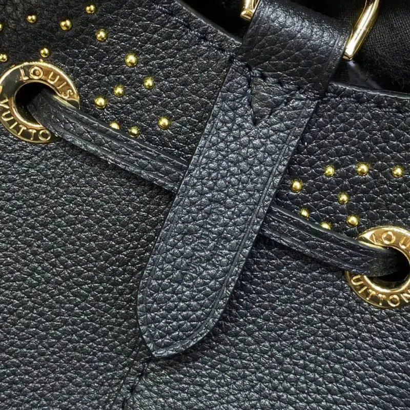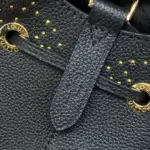 Studded Embossed Monogram Drawstring Bucket Bag in Black M46734