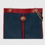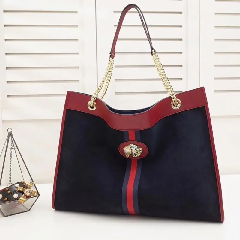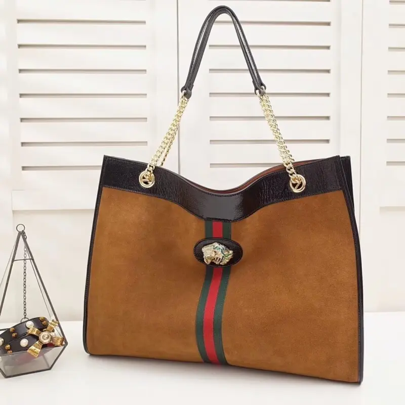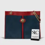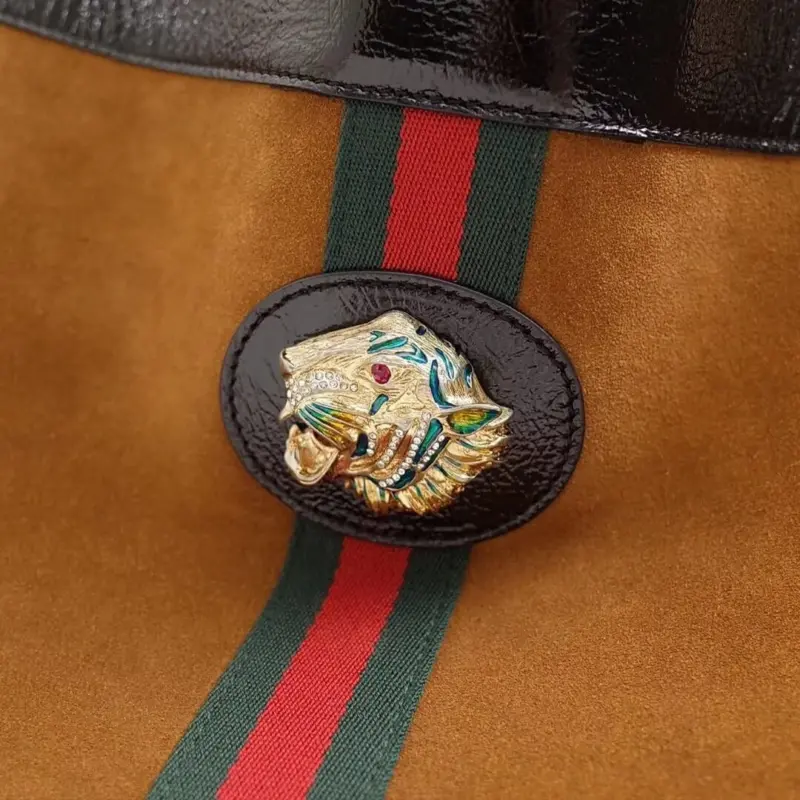 This elegant shoulder bag combines luxurious suede with sleek patent leather trim for a sophisticated and textured look. The design’s centerpiece is a stunning, crystal-embellished tiger head, an eye-catching detail inspired by vintage jewelry that adds a touch of retro glamour. Its spacious and structured silhouette makes it an ideal accessory for both everyday use and special occasions.