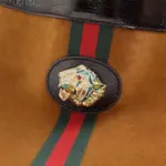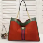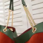 A classic red and green striped ribbon is inlaid on the front, providing a vibrant and timeless contrast. The polished gold-toned chain straps are designed for versatility, featuring a comfortable leather detail that allows the bag to be carried as a shoulder bag or a top handle. Inside, a detachable pouch with a zipper closure helps keep your essentials organized and secure.