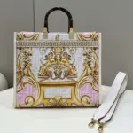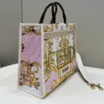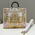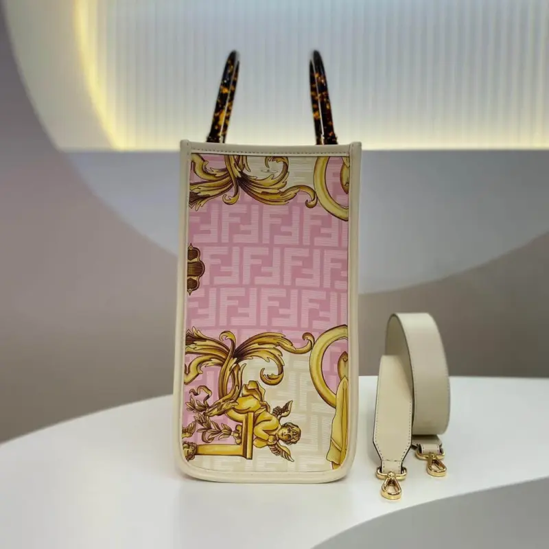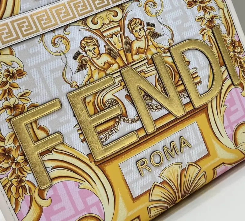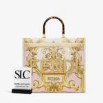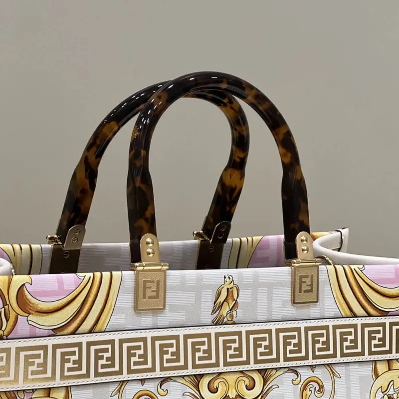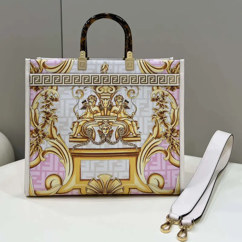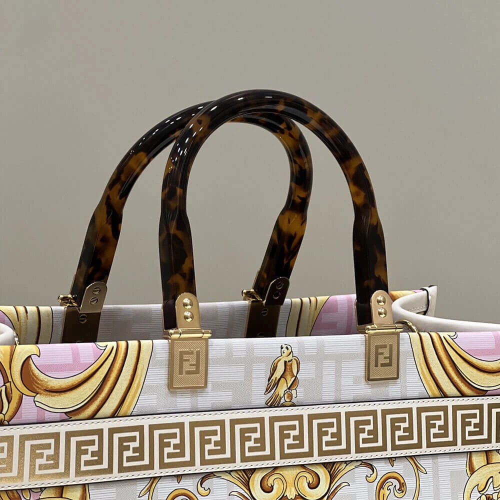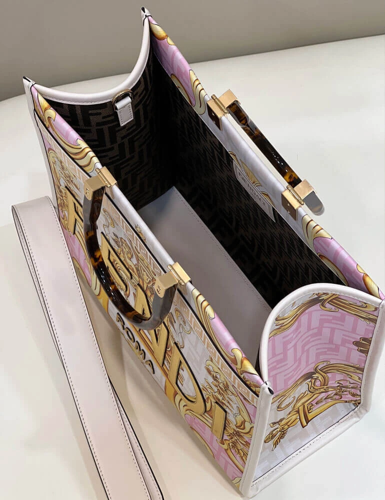Crafted from luxurious leather, this medium tote shopper makes a bold statement with its unique, multi-colored print. The design features a stunning combination of ornate, baroque-style graphics fused with a repeating geometric pattern, creating a truly distinctive and artistic look. This shopper is elegantly finished with gold laminated lettering and features rigid, tortoiseshell-effect plexiglass handles for a touch of retro sophistication.