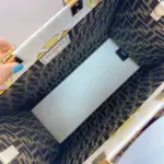 Designed for both beauty and practicality, this bag opens to a spacious main compartment, generously lined with a fabric showcasing a complementary geometric motif. The versatile design can be carried by its chic top handles or worn comfortably on the shoulder, thanks to a detachable leather strap, making it the perfect accessory for any occasion.