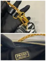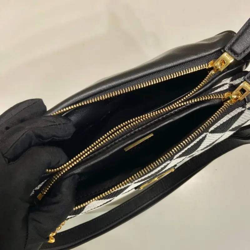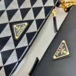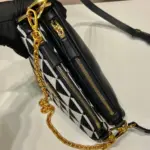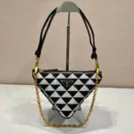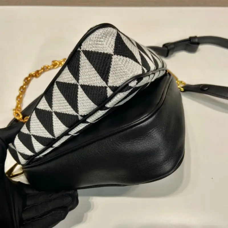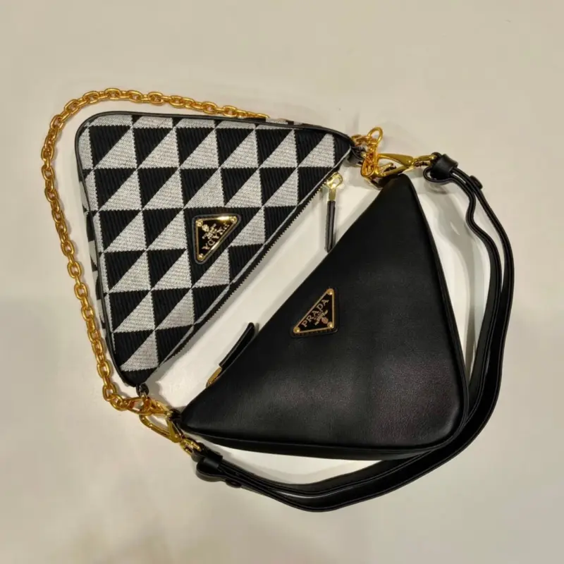 This mini bag expresses uniqueness and modernity through its minimalist and universal silhouette. The iconic geometric shape inspires this accessory’s modernist and modular design, which allows it to be worn in a variety of ways. The two triangular elements, crafted from leather and fabric, can be separated and worn as single handbags or converted into clutches when the handles are removed.