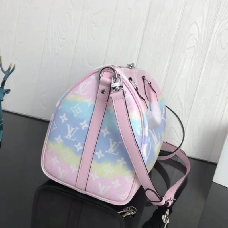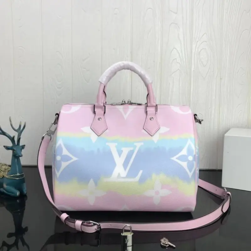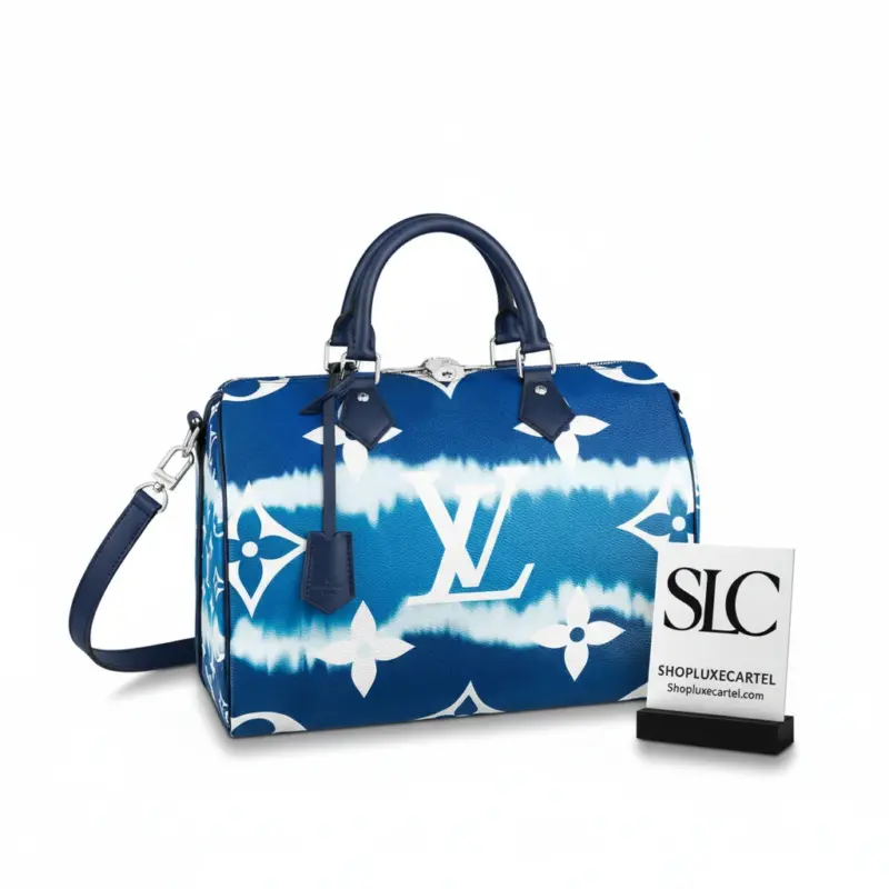 Evoking a fresh, beach-inspired feel, this city bag features a vibrant tie-dye print on a durable coated canvas. The classic, recognizable shape is complemented by rolled-leather top handles, making it a timeless accessory for any occasion. Its structured design is both elegant and practical for everyday use.