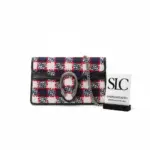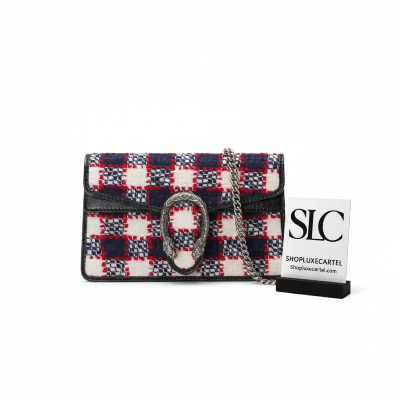Discover a beautifully structured mini bag, expertly crafted from classic check tweed and accented with a contrasting leather trim for a refined, vintage-inspired look. The bag is distinguished by its unique closure, featuring a textured tiger head spur that adds a touch of bold elegance. This compact accessory is perfectly sized for your essentials and offers versatile styling options.