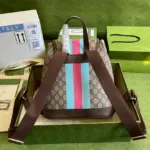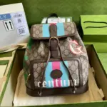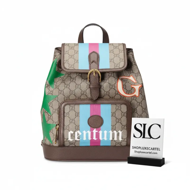 Make a statement with this uniquely designed backpack, featuring a vibrant and colorful geometric print that includes stars and striped details. Crafted from a durable coated canvas material with a lower environmental impact, this bag showcases a distinctive interlocking G monogram print. The design is beautifully accented with rich brown leather trim, offering a sophisticated and contemporary look for any occasion.
