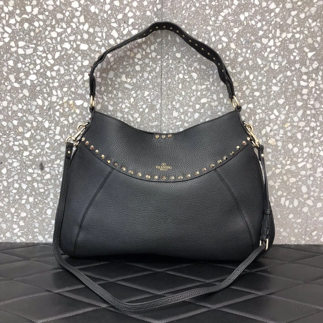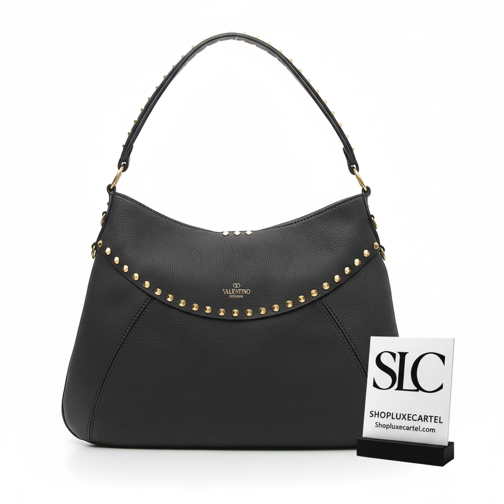 Experience the perfect fusion of effortless style and refined detail with this beautifully crafted shoulder bag. Made from premium grainy calfskin leather, its classic hobo silhouette is given a modern edge with a distinctive trim of shimmering studs. This bag’s relaxed yet polished aesthetic makes it a versatile accessory for both day and night.