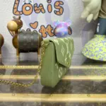 This elegant pochette showcases a sophisticated two-tone color scheme, crafted from supple cowhide leather featuring a beautifully embossed floral and initial pattern. Its versatile design is complemented by a removable chain strap, allowing it to be worn as a chic shoulder bag or a practical crossbody. The polished, gold-finish hardware adds a touch of refined luxury to its overall aesthetic.