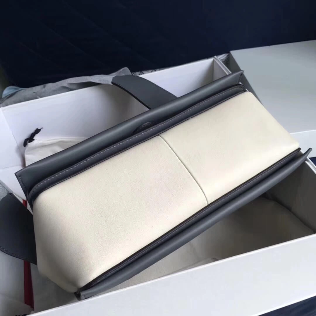 Experience refined style with this impeccably designed medium shoulder bag, featuring a striking grey and white two-tone palette. Crafted from exquisitely soft lambskin with a supple calfskin lining, this bag showcases a clean, structured silhouette. Its minimalist aesthetic is complemented by a comfortable, wide leather strap, making it a perfect accessory for both day and evening wear.