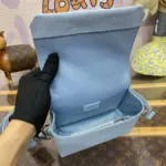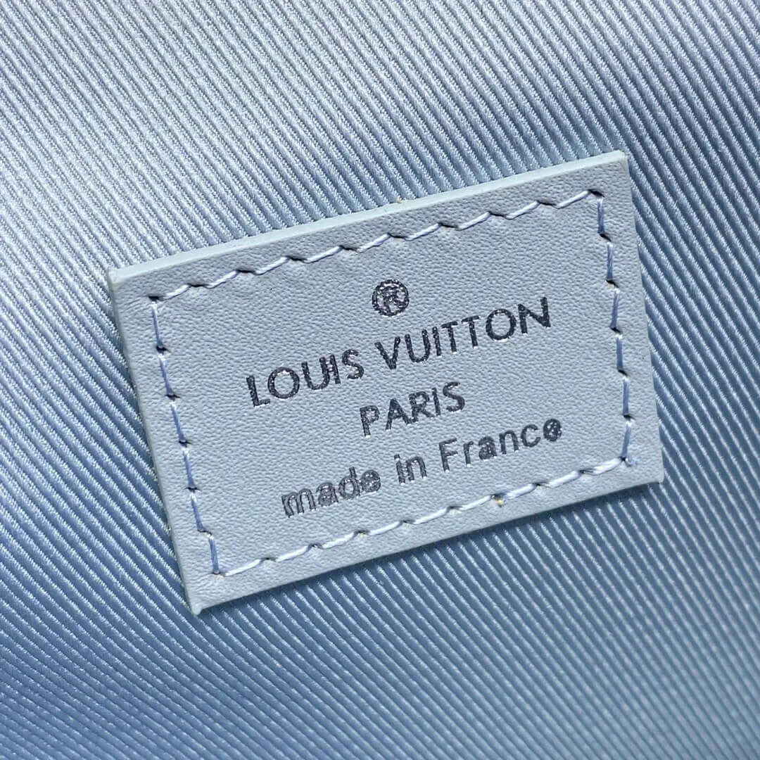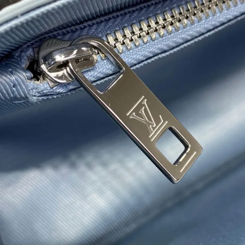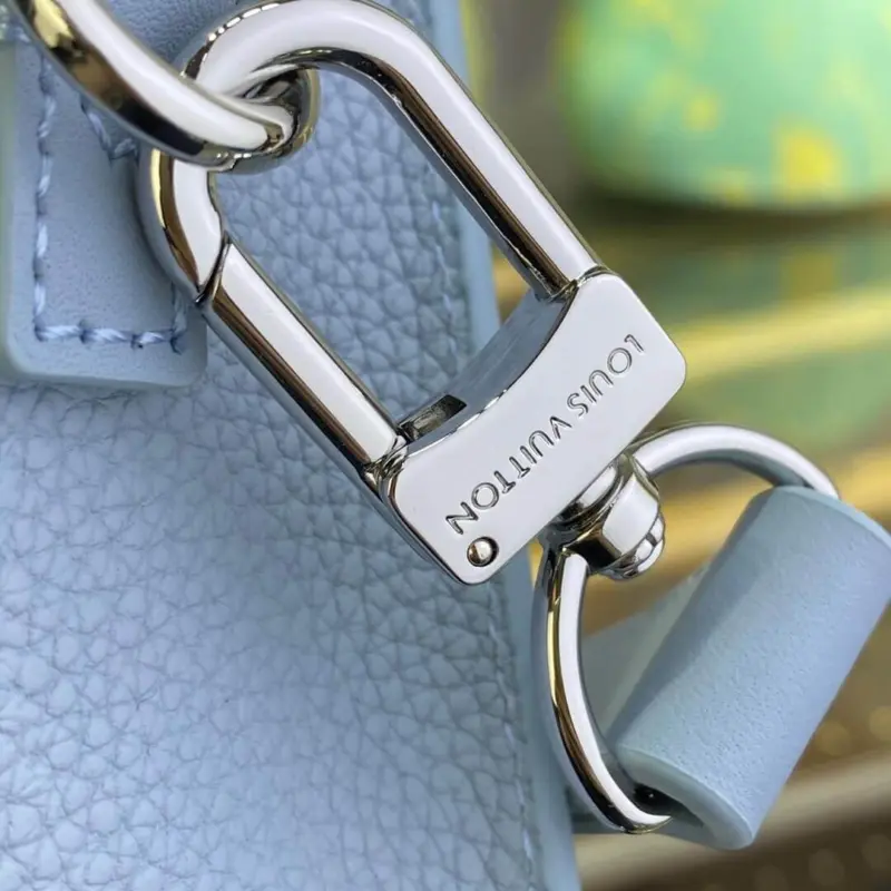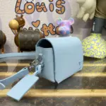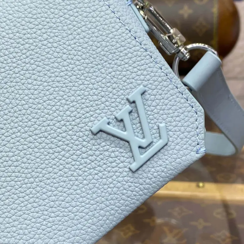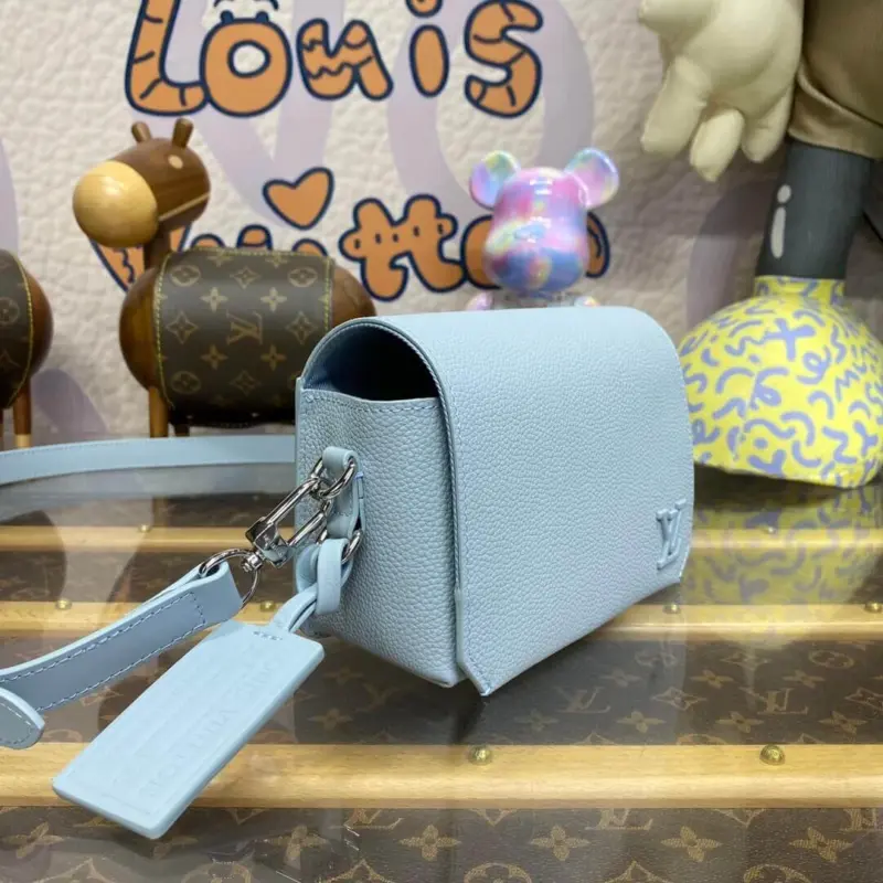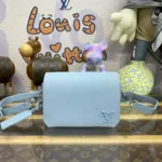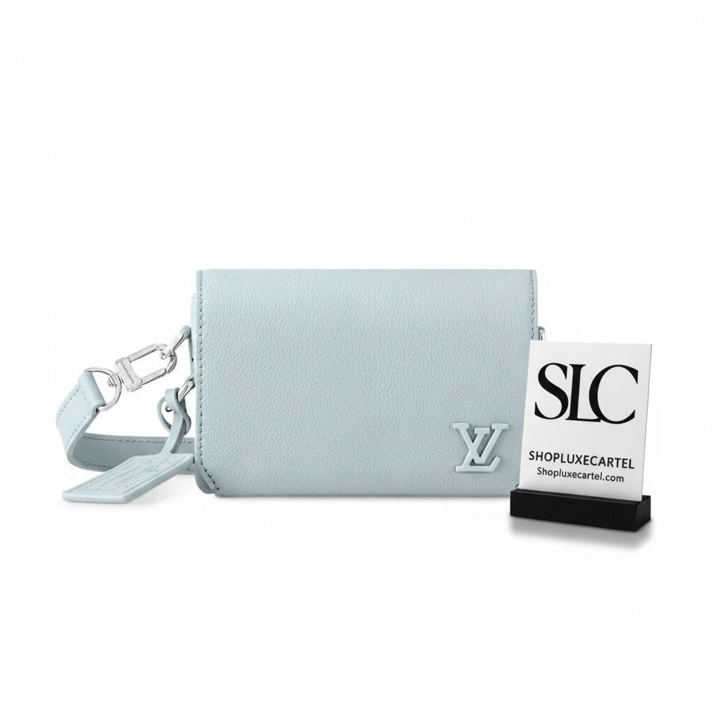 Constructed from supple cowhide leather in a serene cloud blue hue, this piece is a testament to fine craftsmanship. It features distinctive bias-cut corners on its magnetic flap and is elegantly appointed with polished, silver-color hardware and a discreet tone-on-tone metal emblem. The thoughtfully organized interior ensures your belongings are always in place.