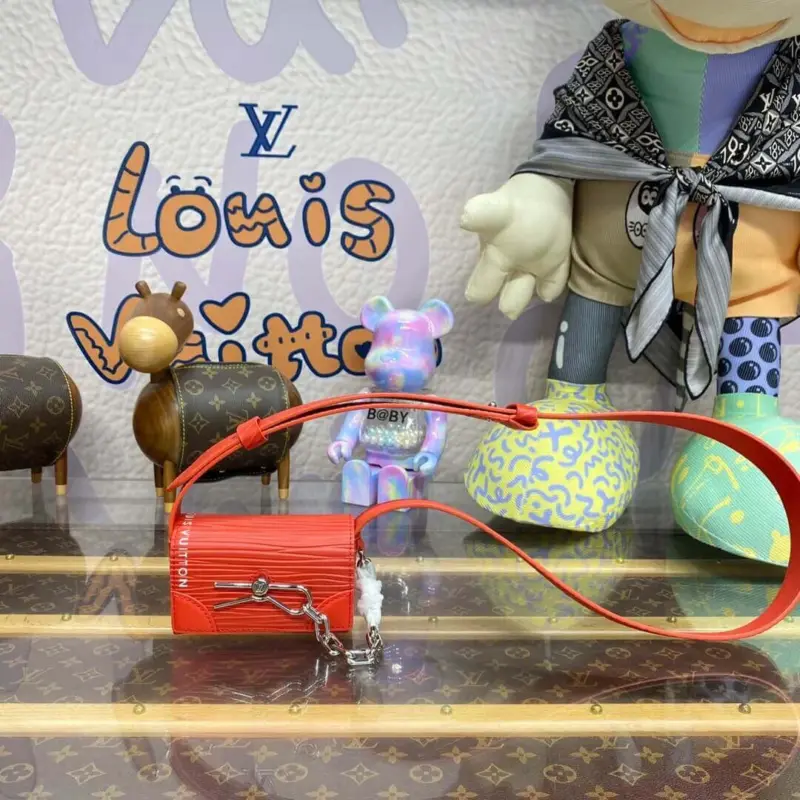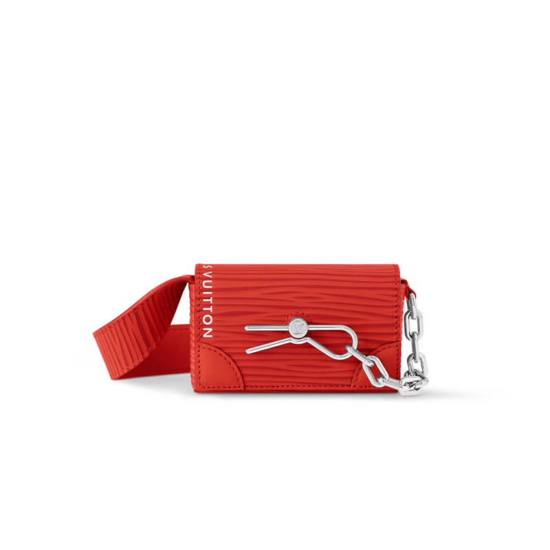 This beautifully crafted travel pouch offers a compact and sophisticated solution for carrying your essentials. Designed with a nod to classic luggage aesthetics, it combines heritage-inspired details with a modern, streamlined silhouette. The design is distinguished by its unique hardware, including a decorative chain and a distinctive safety pin element, creating a truly unique accessory.