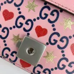 Celebrate a special occasion with this exquisitely crafted mini shoulder bag, designed with a romantic and festive spirit. Its structured silhouette is fashioned from fine pink leather, adorned with a charming print of hearts, stars, and a classic geometric motif in shades of blue, red, and gold. This compact bag is the perfect accessory for adding a touch of whimsy and elegance to any ensemble.