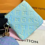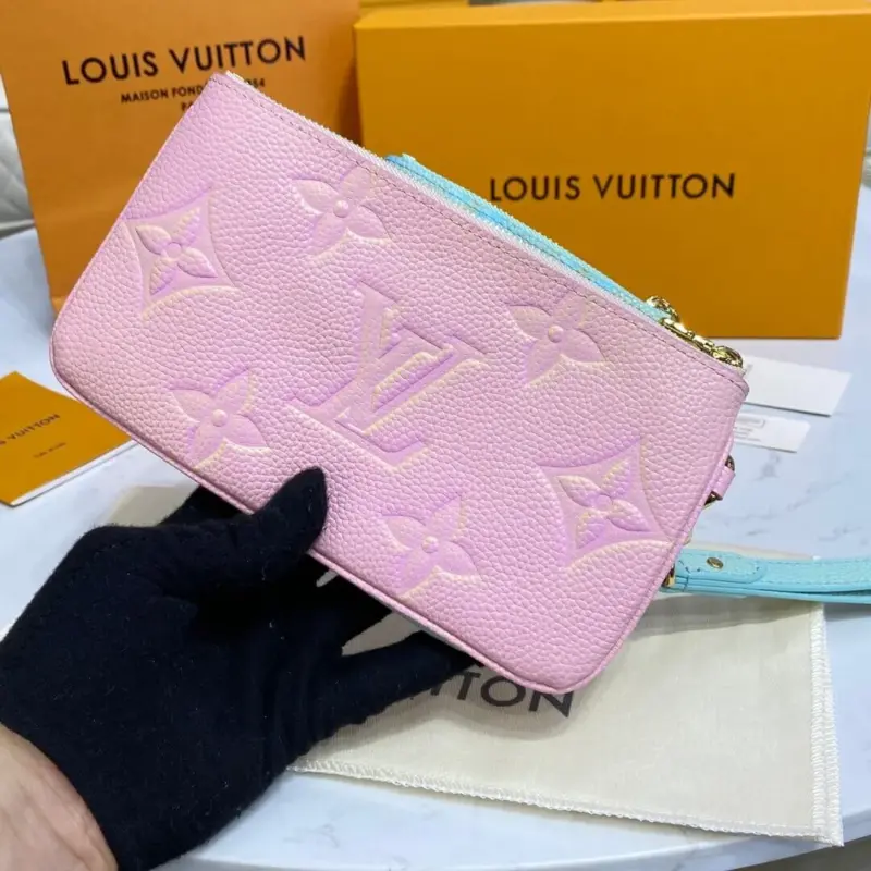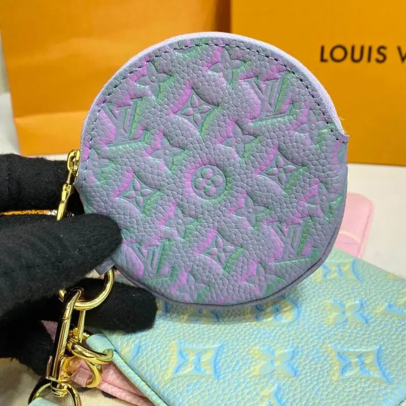 Discover ultimate versatility with this innovative three-piece pouch set, designed to adapt to your ever-changing needs. This set features three distinct pouches in complementary colors, each crafted from supple, grained leather with a beautiful embossed monogram pattern. The leather is treated with a unique process to give it a subtle, shimmering effect reminiscent of a starlit sky, adding a touch of enchantment to a highly functional design.