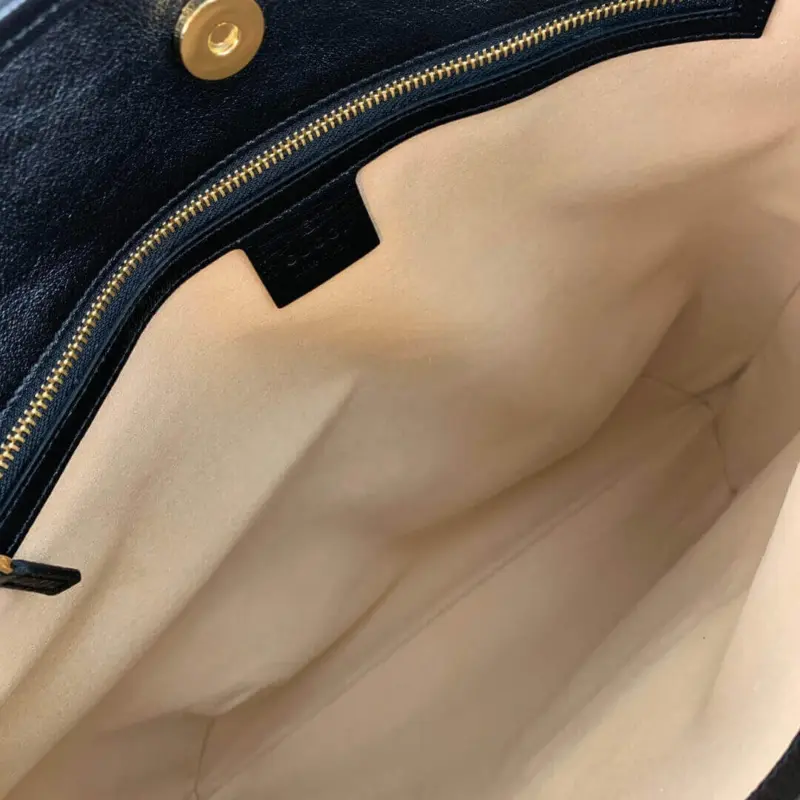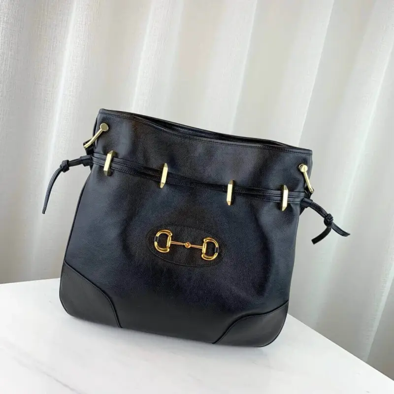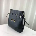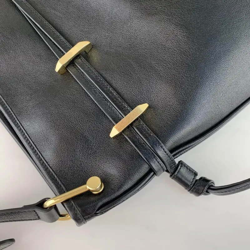 The design incorporates a functional and detailed drawstring closure, complemented by a secure magnetic snap. Its versatile and sophisticated shape makes it an ideal accessory for a variety of occasions, seamlessly transitioning from day to evening wear. The interior is thoughtfully designed with a soft, suede-like microfiber lining and a zip pocket for organized storage.