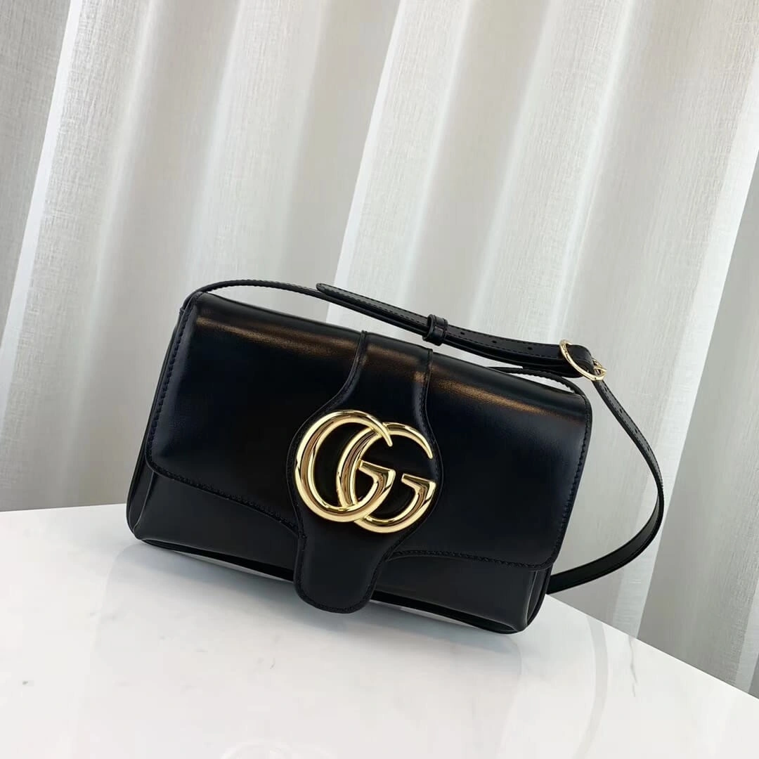 - Smooth black leather with a soft, shiny finish