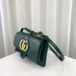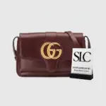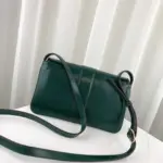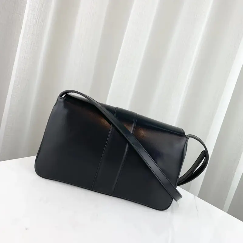 Channeling a timeless look from the 1970s, this small shoulder bag is defined by its clean lines and sophisticated, vintage-inspired aesthetic. The design is centered around an exaggerated flap closure, highlighted by a striking oversized metal emblem that adds a touch of retro elegance. Crafted from smooth, lustrous leather, its structured silhouette offers a polished finish for any occasion.