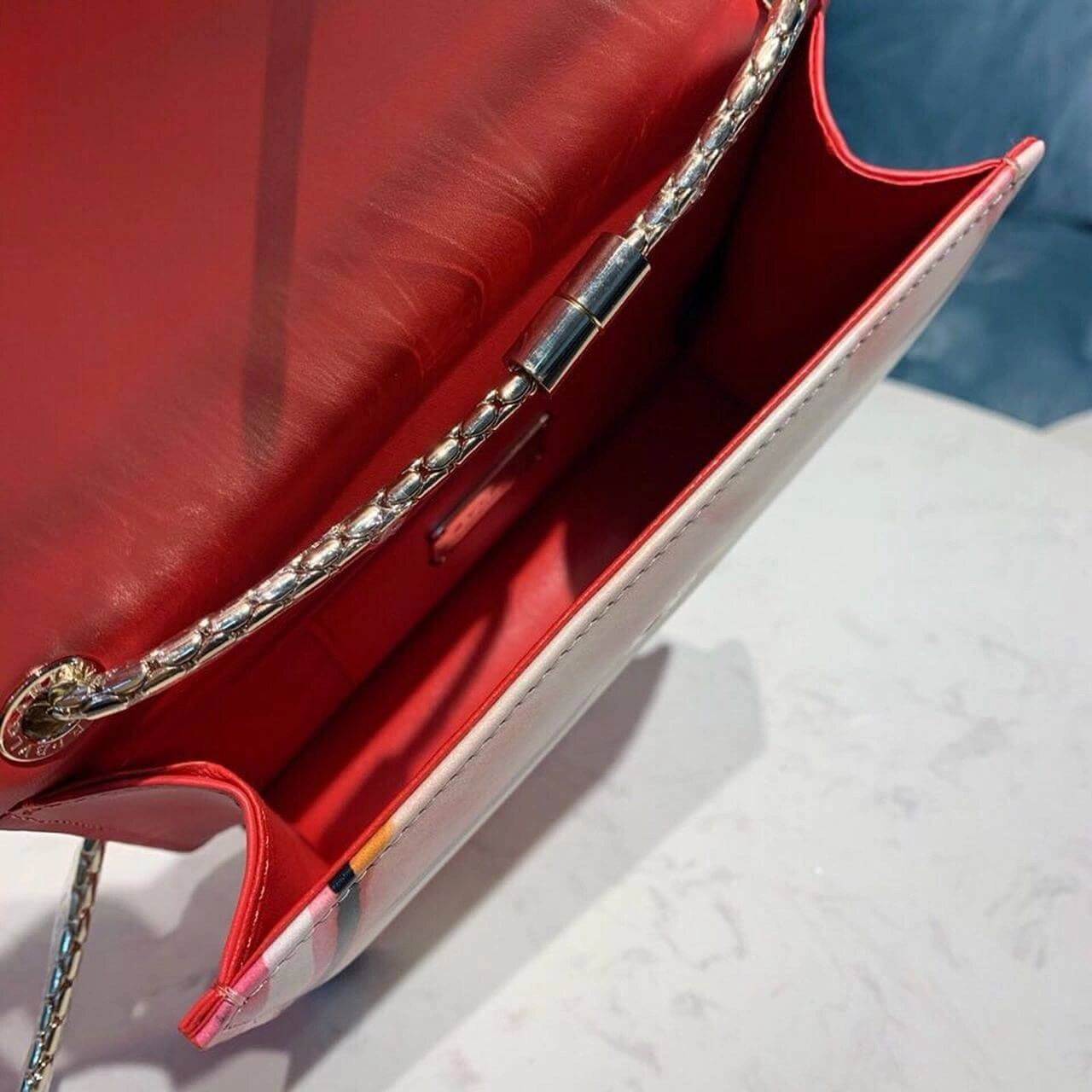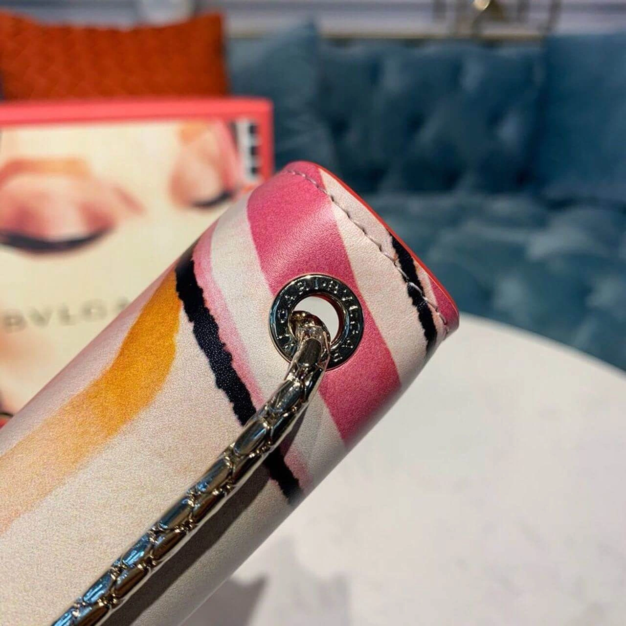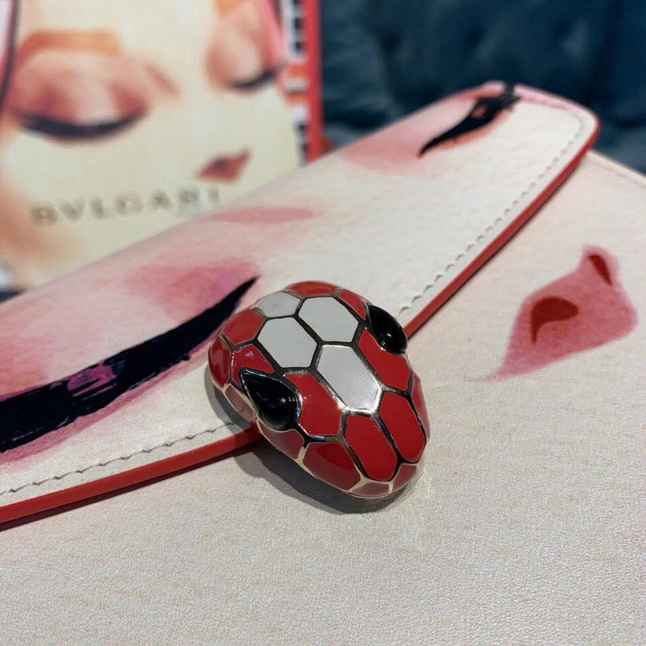 The bag’s most striking feature is its ornate, decorative serpent head closure, rendered in light rose gold-plated brass with detailed enamel accents. A delicate, sinuous chain strap complements the design, allowing for versatile wear as a shoulder or crossbody bag. This compact yet functional accessory includes a small interior pocket mirror, making it an ideal companion for any occasion.