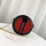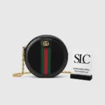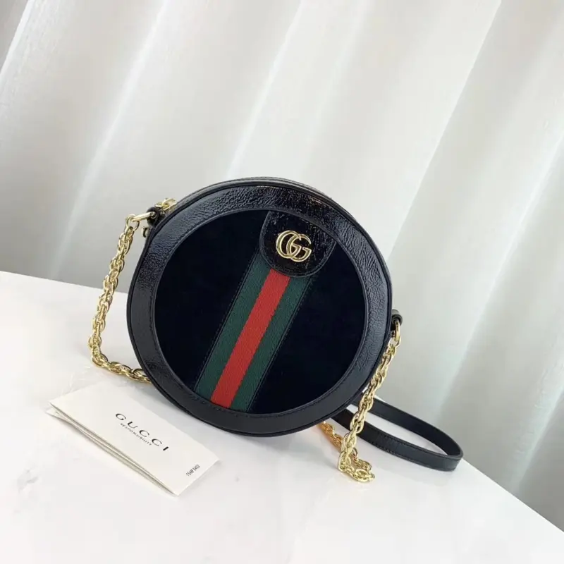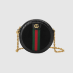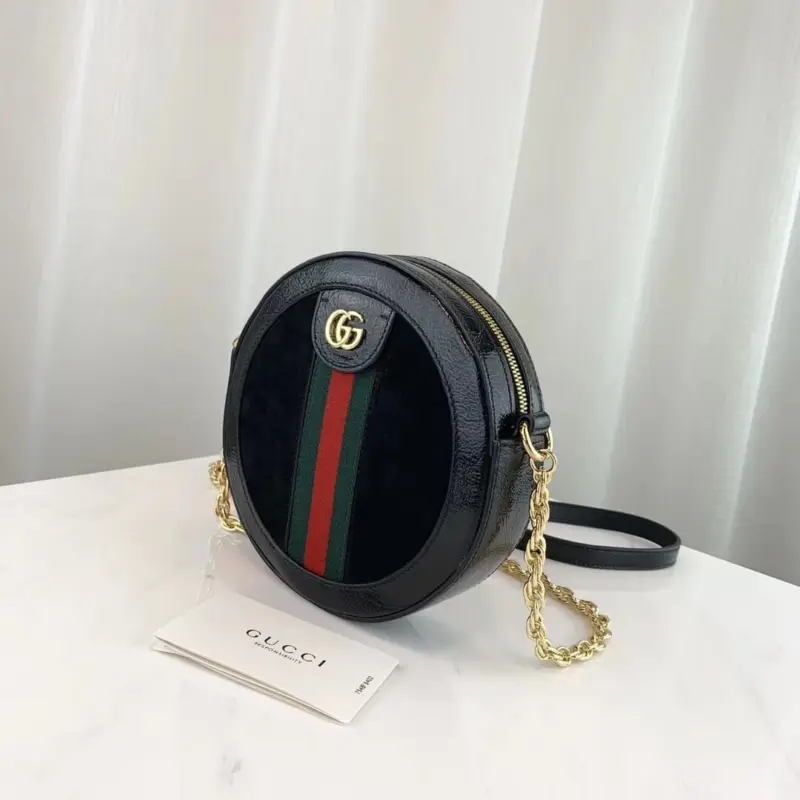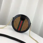 Embrace timeless style with this beautifully crafted circular mini bag. Its unique round silhouette is rendered in luxurious black suede and trimmed with high-shine patent leather, creating a sophisticated play on textures. A classic green and red striped inlay runs down the center, offering a touch of vibrant, heritage-inspired design.