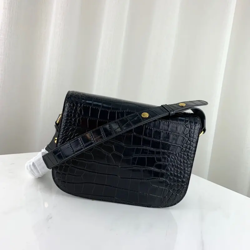 Embrace timeless elegance with this exquisitely crafted shoulder bag, inspired by a classic 1955 design. Made from luxurious black crocodile leather, this piece features a structured silhouette and gleaming gold-toned hardware that adds a touch of sophistication to any outfit. The design is a perfect blend of vintage charm and modern functionality, making it an ideal accessory for both day and evening wear.
