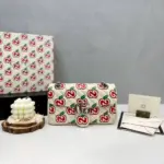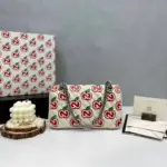 Embrace a touch of timeless elegance with this beautifully crafted crossbody shoulder bag. Featuring a supple, quilted chevron leather exterior, this piece is adorned with a playful and charming apple print that adds a whimsical yet sophisticated flair to any outfit. The design is perfectly complemented by antique gold-toned hardware, including a striking double-letter emblem on the front flap that enhances its classic appeal.