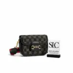 Discover a timeless accessory that blends classic equestrian-inspired design with modern versatility. This mini bag is crafted from a durable denim jacquard fabric featuring a sophisticated geometric pattern, beautifully contrasted with smooth black leather trim. The polished, gold-toned hardware adds a touch of luxury, making it a perfect companion for any occasion, from casual outings to evening events.
