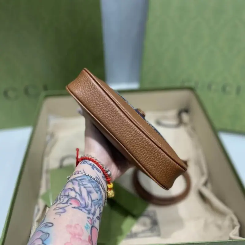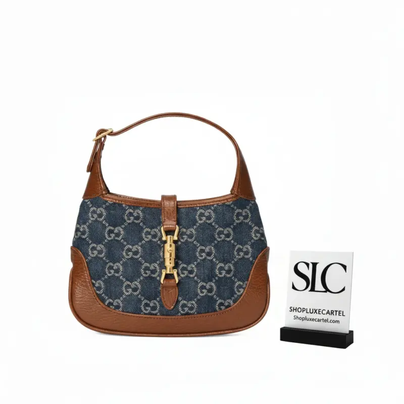 This mini shoulder bag brings a timeless, recognizable shape to the forefront, presented in a durable jacquard denim with a geometric pattern. The design is beautifully accented with rich brown leather trim and polished gold-toned hardware, creating a look that is both classic and contemporary.