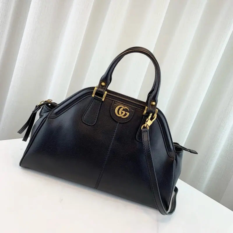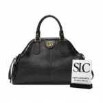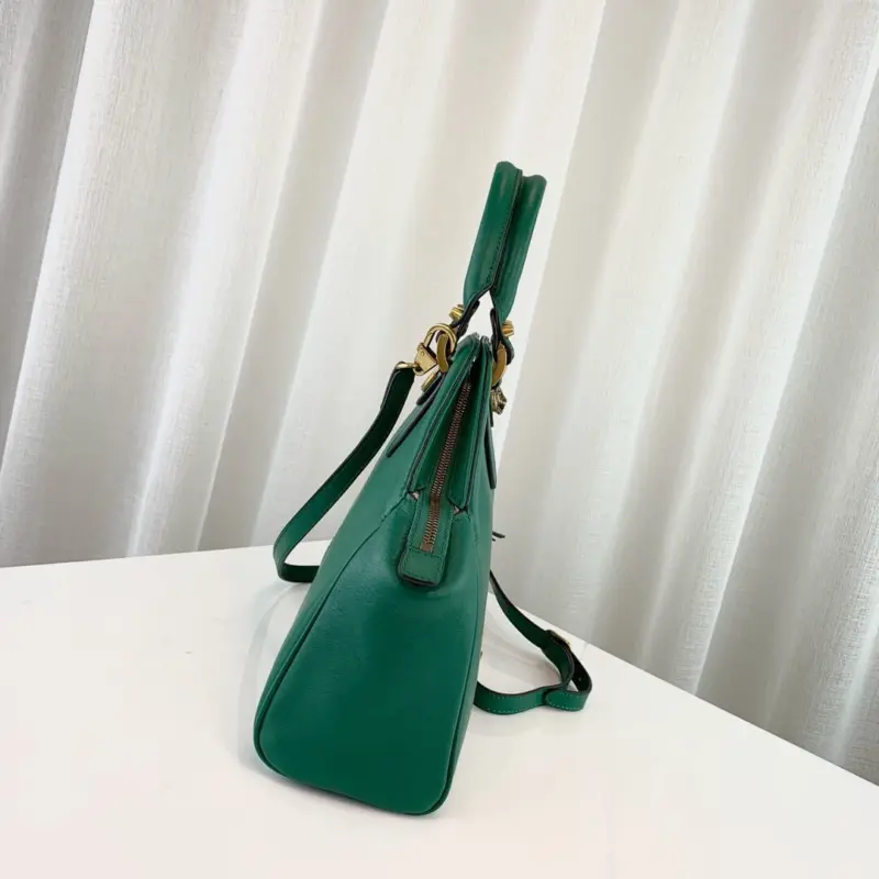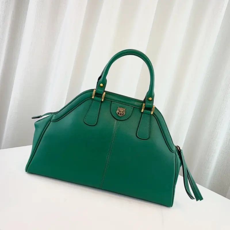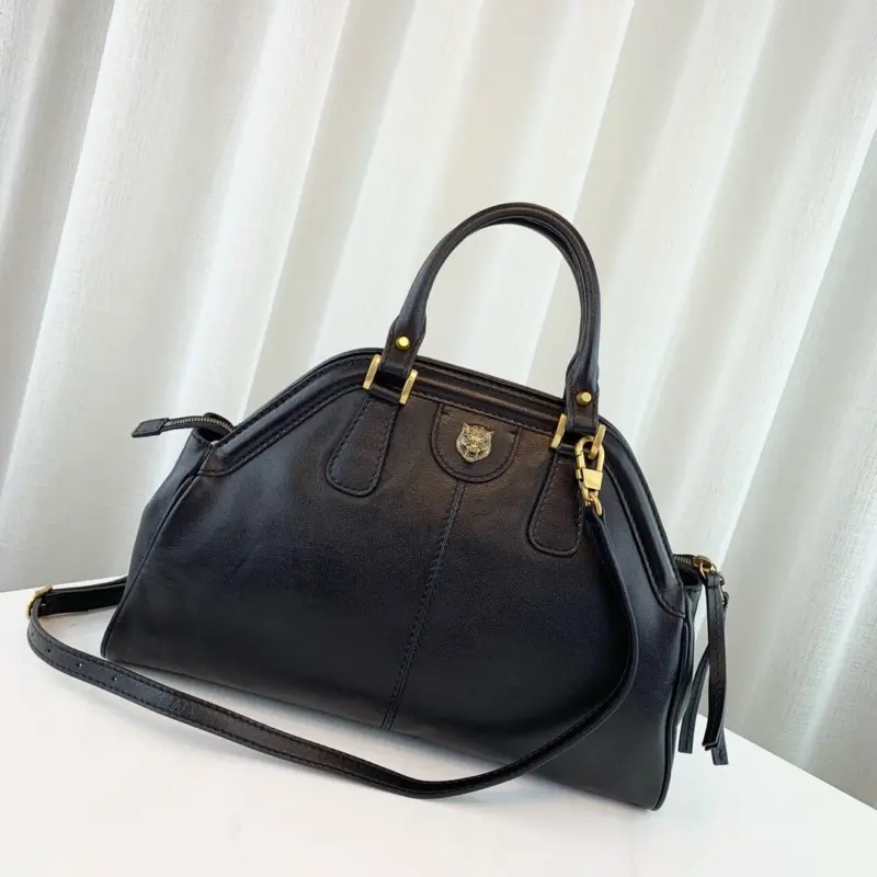 One side is adorned with a classic interlocking emblem, while the opposite side showcases a decorative feline head detail in matching hardware. This thoughtfully designed bag combines timeless style with practical features, making it a versatile accessory for any occasion.