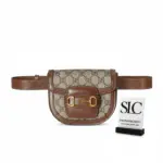 Experience timeless design and modern versatility with this beautifully crafted rounded belt bag. Inspired by classic equestrian aesthetics, this accessory offers both sophisticated style and practical functionality. The main body is constructed from a durable coated canvas featuring a beige and ebony monogram pattern, complemented by rich brown leather trim and polished, gold-toned hardware for a truly refined finish.