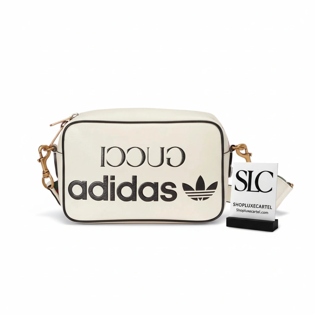 Expertly crafted from genuine leather, this piece is distinguished by an all-over monogram and geometric emblem print. It is elegantly finished with contrasting black leather trim and a signature green and red striped webbing detail, adding a pop of color and a nod to classic athletic designs. The interior is fully lined and features a zip pocket for secure organization.