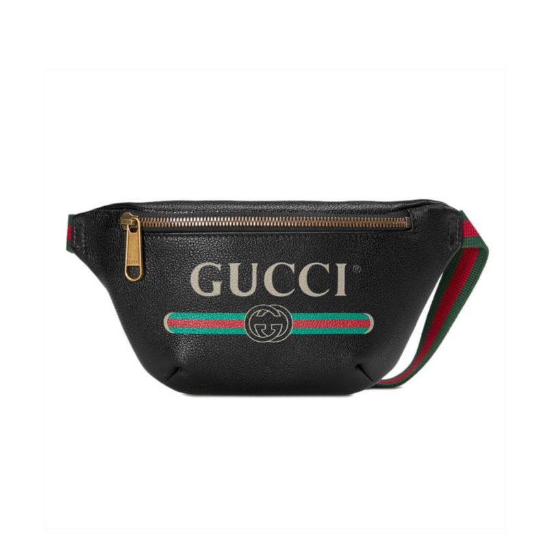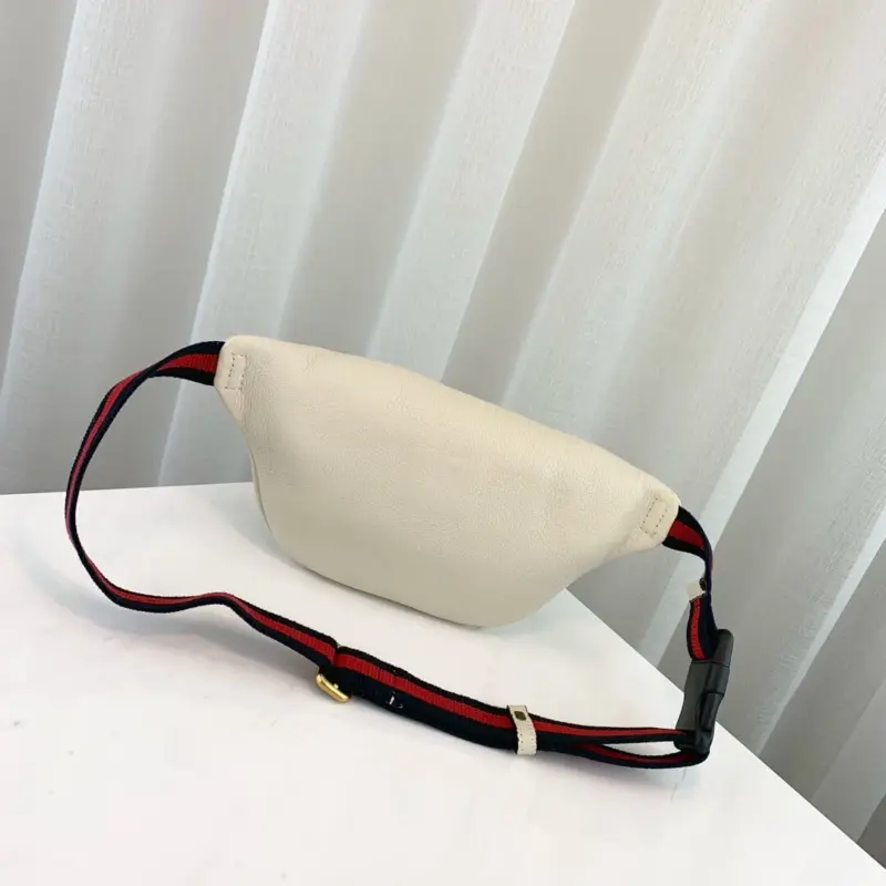 Drawing inspiration from the bold graphic prints of the 1980s, this versatile belt bag makes a striking statement. Crafted from supple, textured leather, it features a retro-style logo motif on the front for a touch of throwback flair. The design is complemented by a distinctive blue and red striped strap detail, adding a classic, sporty touch to its silhouette.