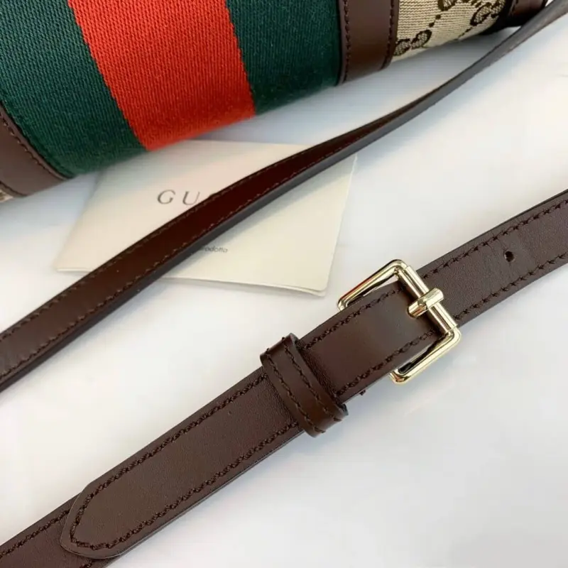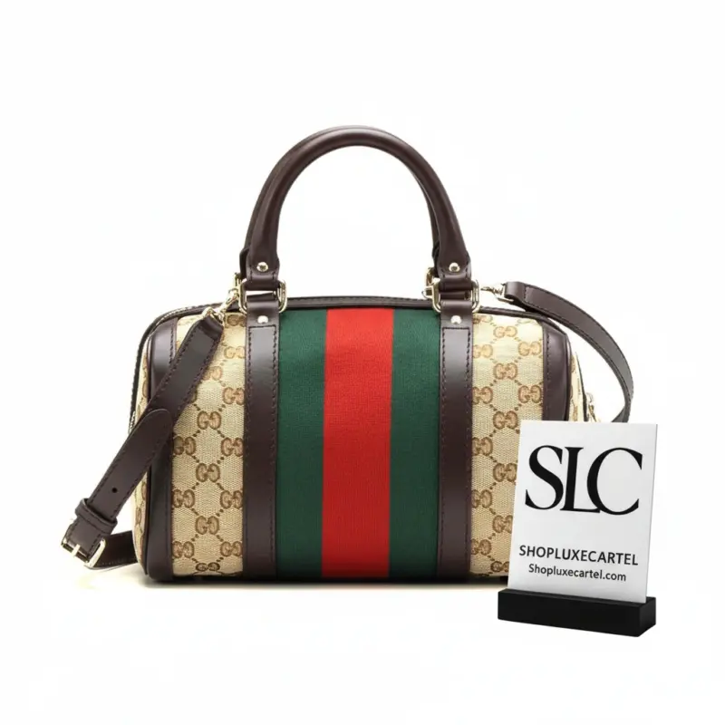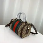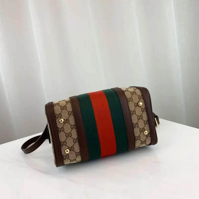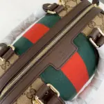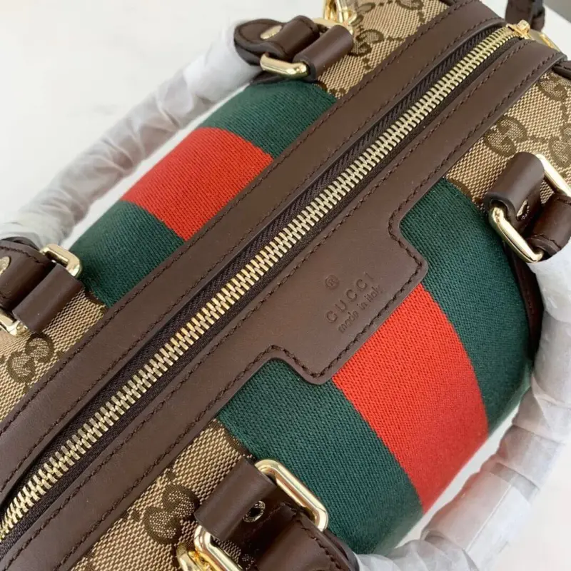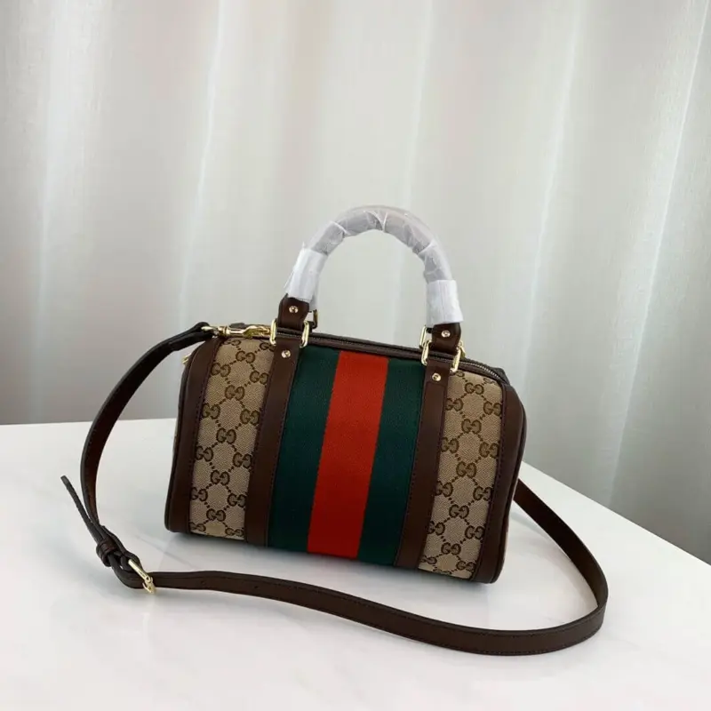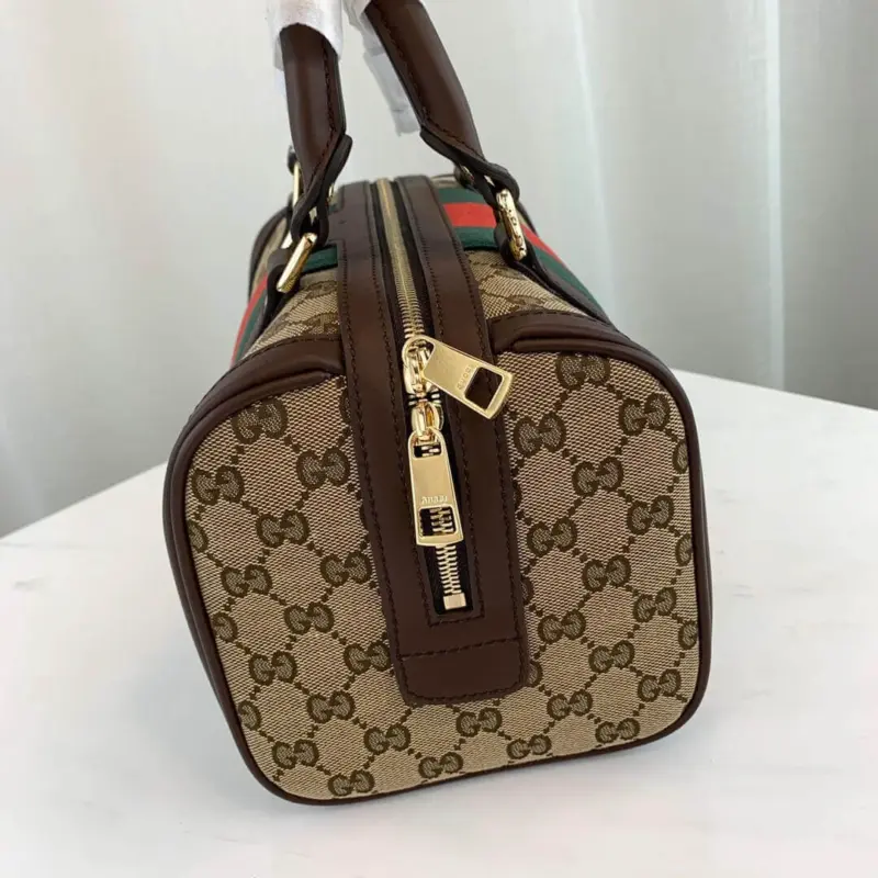 Experience the perfect blend of timeless style and modern functionality with this classic Boston travel bag. Designed with a structured, iconic silhouette, this bag is crafted from durable canvas featuring a sophisticated geometric pattern in coordinating beige and coffee tones. Rich coffee-colored leather trim and a signature green and red striped webbing detail provide a touch of refined, vintage-inspired elegance, making it a versatile choice for weekend trips or as a chic everyday carryall.