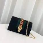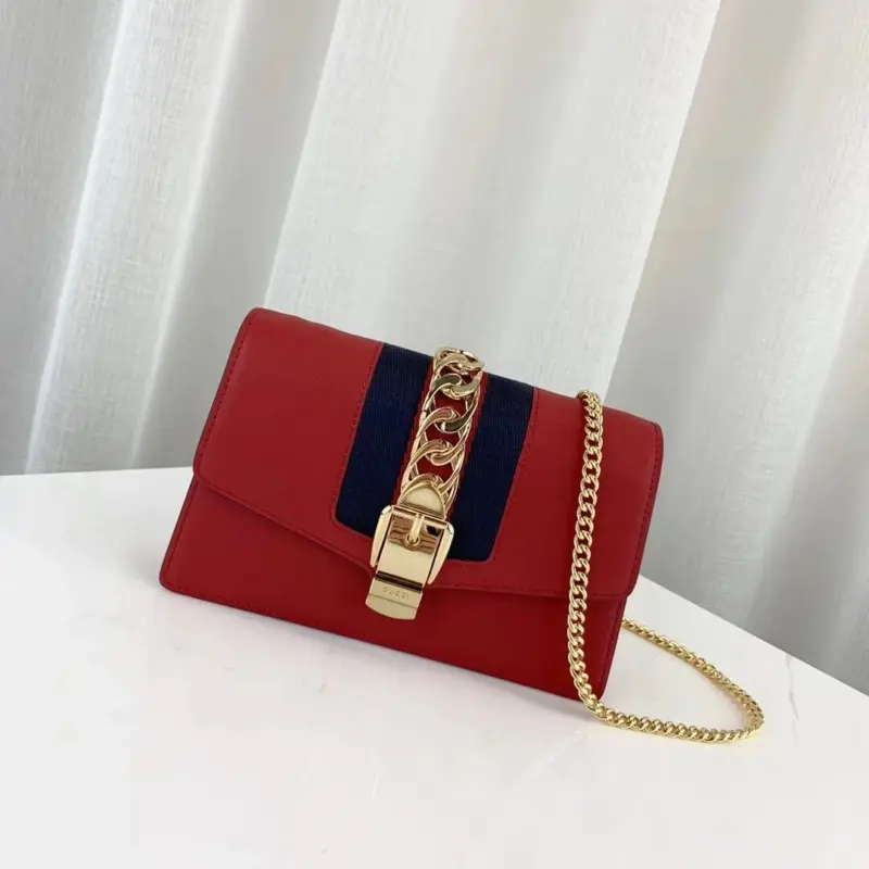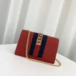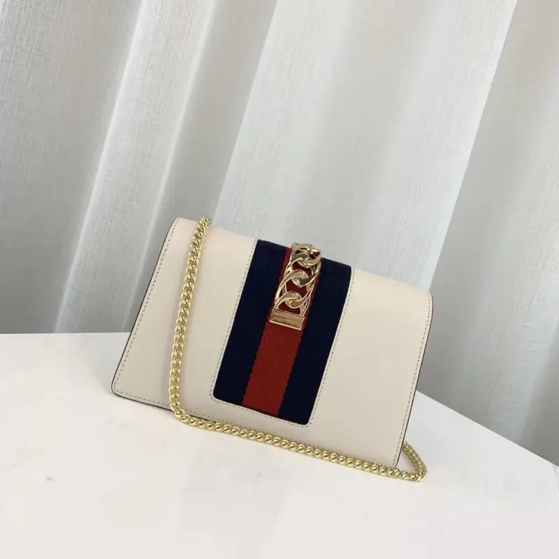 This beautifully structured super mini shoulder bag is crafted from smooth, classic leather for a timeless appeal. It features a distinctive striped webbing detail inlaid into the front flap, elegantly decorated with a polished gold-toned chain and buckle ornament. The compact size is perfect for carrying just the essentials, making it a versatile accessory for both day and evening wear.