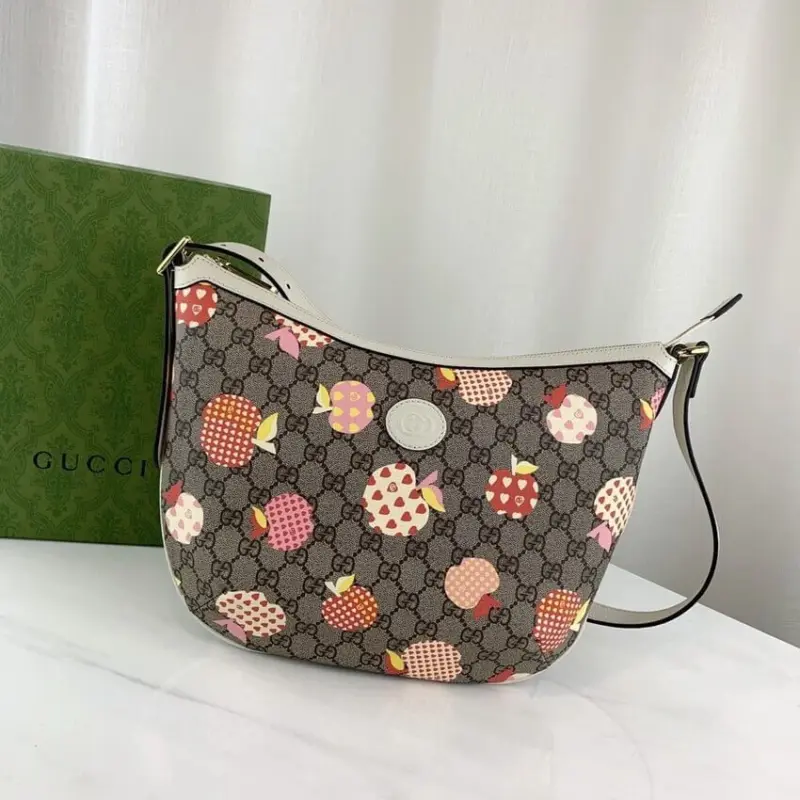 Showcasing a delightful blend of classic design and playful character, this stylish camera bag is an essential accessory. It is crafted from a durable coated canvas that features a timeless monogram pattern, brought to life with a whimsical all-over apple print. The structured silhouette is beautifully accented with crisp white leather trim and polished gold-toned hardware, offering a look of refined charm.