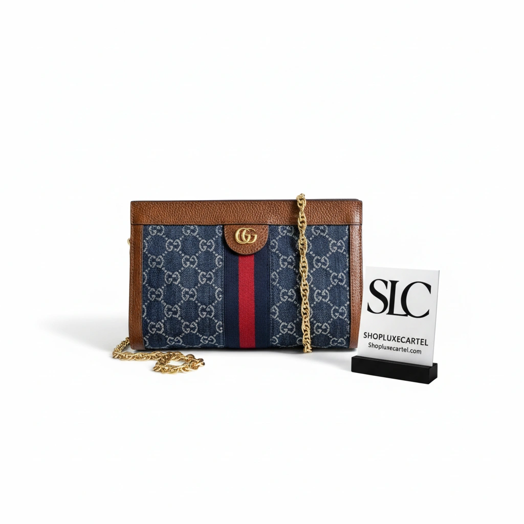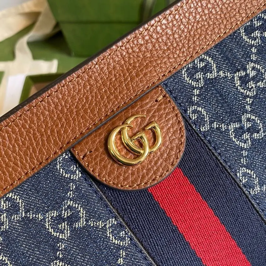 This shoulder bag presents a timeless, vintage-inspired silhouette, beautifully crafted from durable blue denim with rich brown leather trim. The structured dome shape is accentuated by a classic blue and red striped webbing detail inlaid down the center, creating a polished and recognizable look. A distinctive, gold-toned emblem over a magnetic closure adds a touch of sophistication to this elegant accessory.