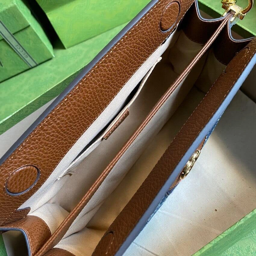 - Exterior: Blue denim with brown leather trim