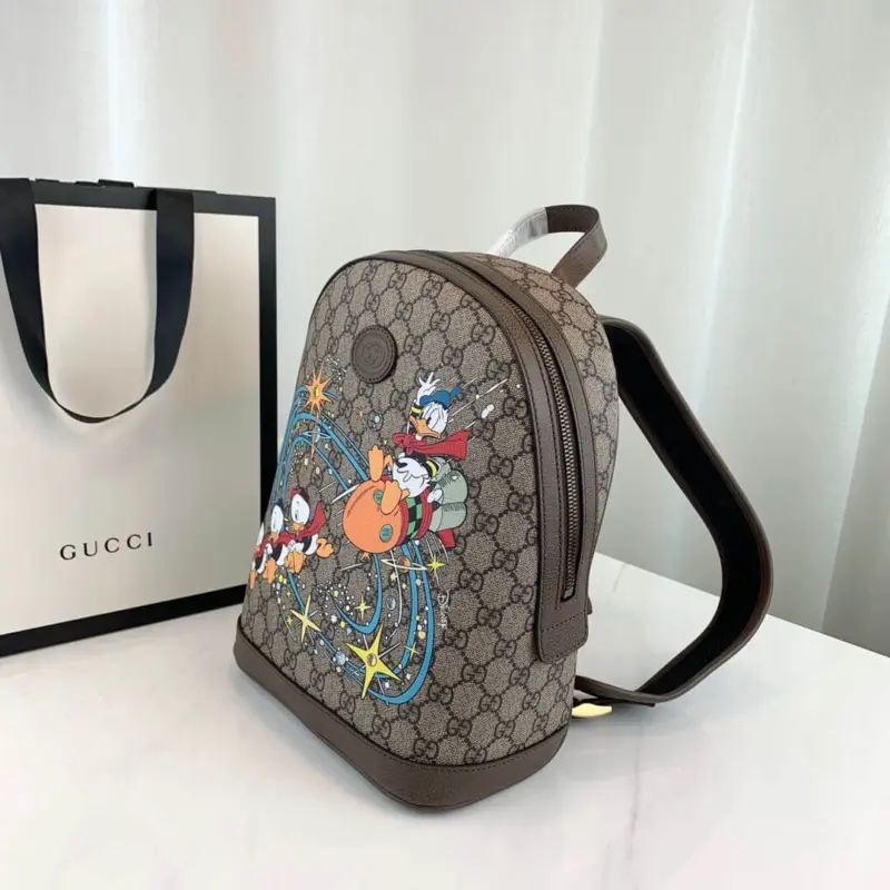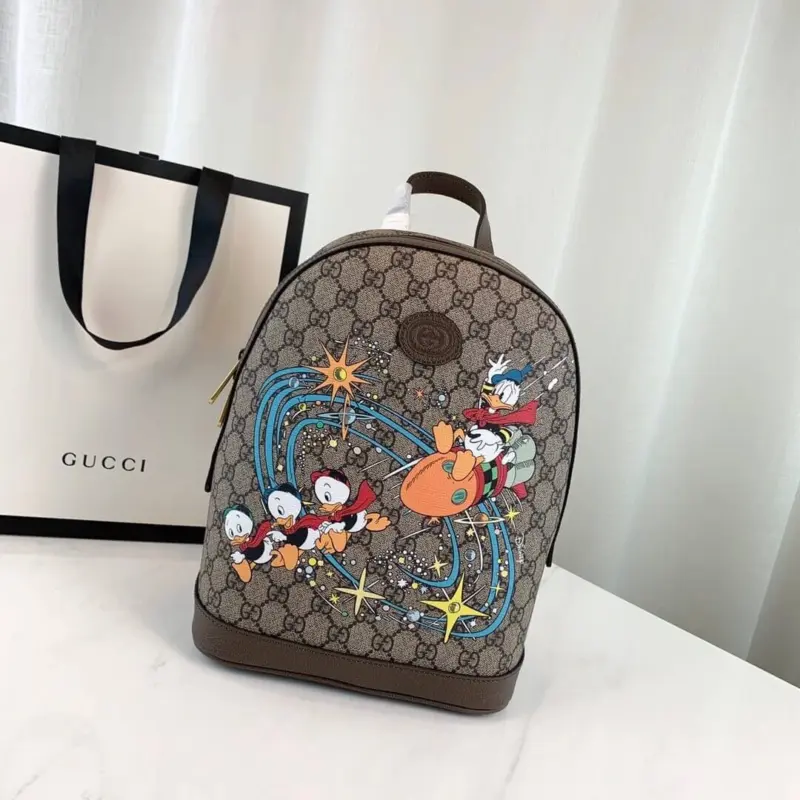 Embrace a touch of playful nostalgia with this charming and compact travel backpack. Featuring a delightful all-over print of a classic cartoon duck and his adventurous nephews, this bag adds a whimsical note to any outing. The durable, coated canvas is finished with high-quality brown leather trim, creating a look that is both fun and refined. Its thoughtfully designed size is perfect for daily essentials or as a trusty companion for your travels.