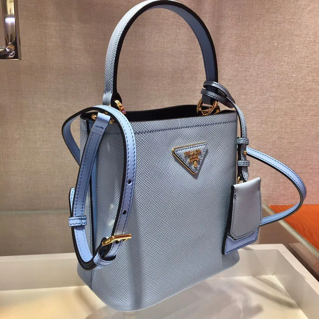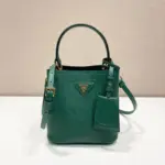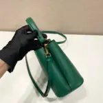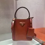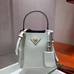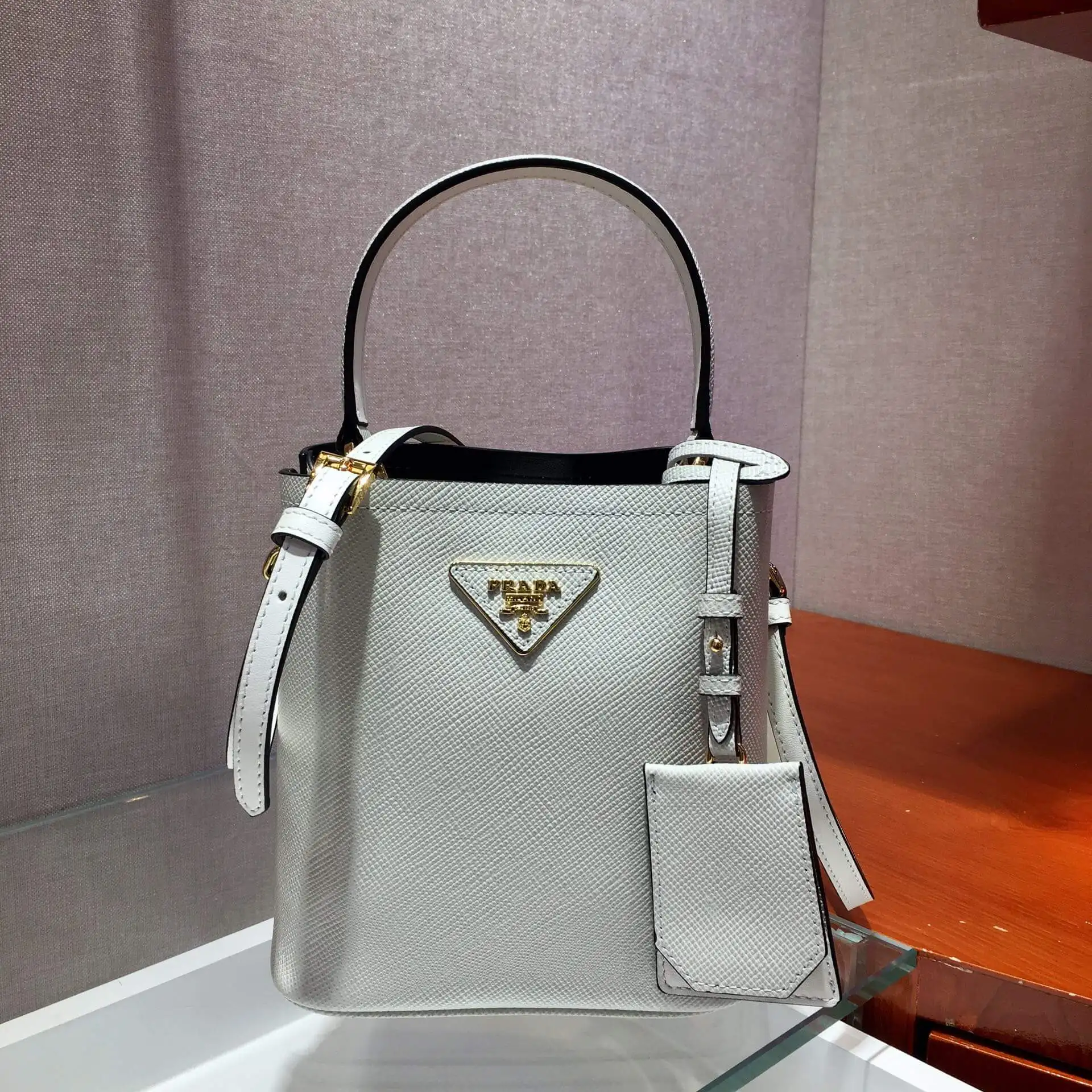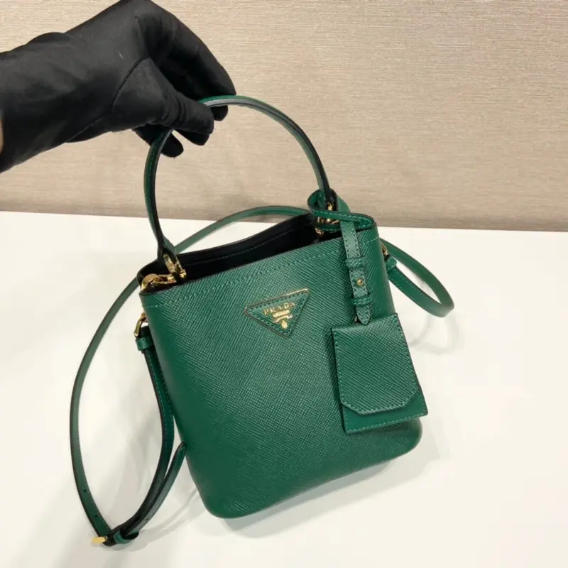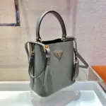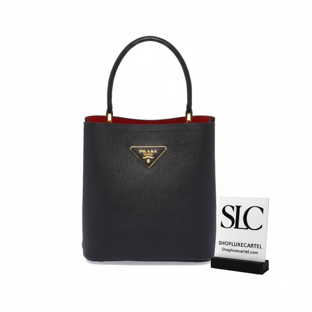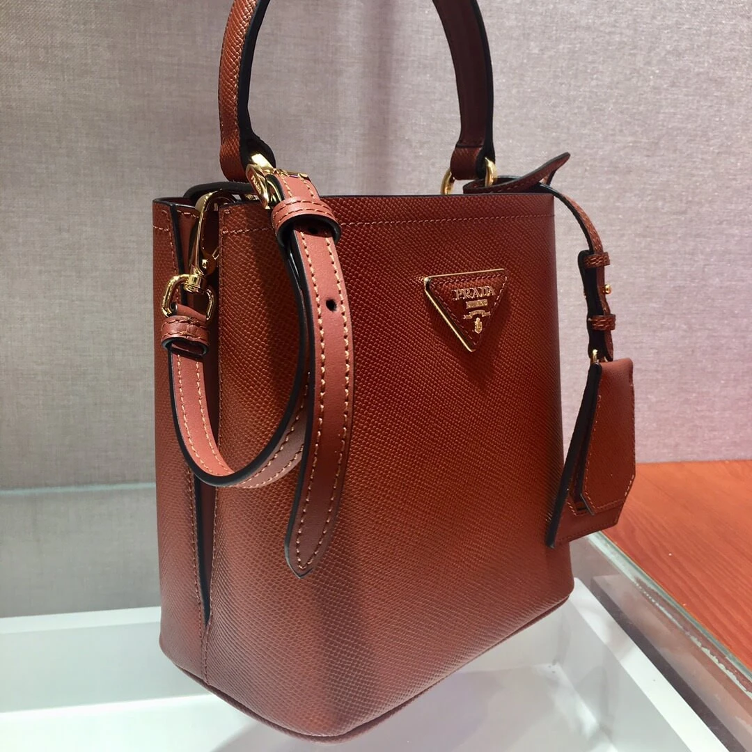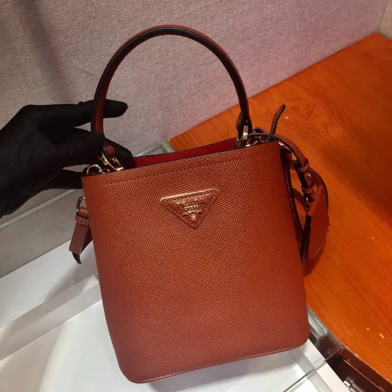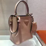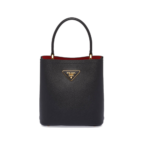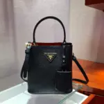 The open-top design, secured with a simple leather strap, reveals a thoughtfully organized interior. Lined in soft, supple leather, the main compartment is divided by a central pocket, making it easy to keep your belongings in order. Polished metal hardware and a distinctive metal emblem on a leather triangle add a final touch of understated luxury to this timeless piece.